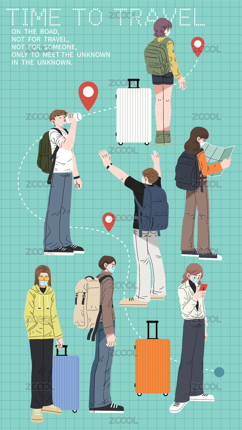 矢量插畫小長假一群戴著口罩去旅行的人