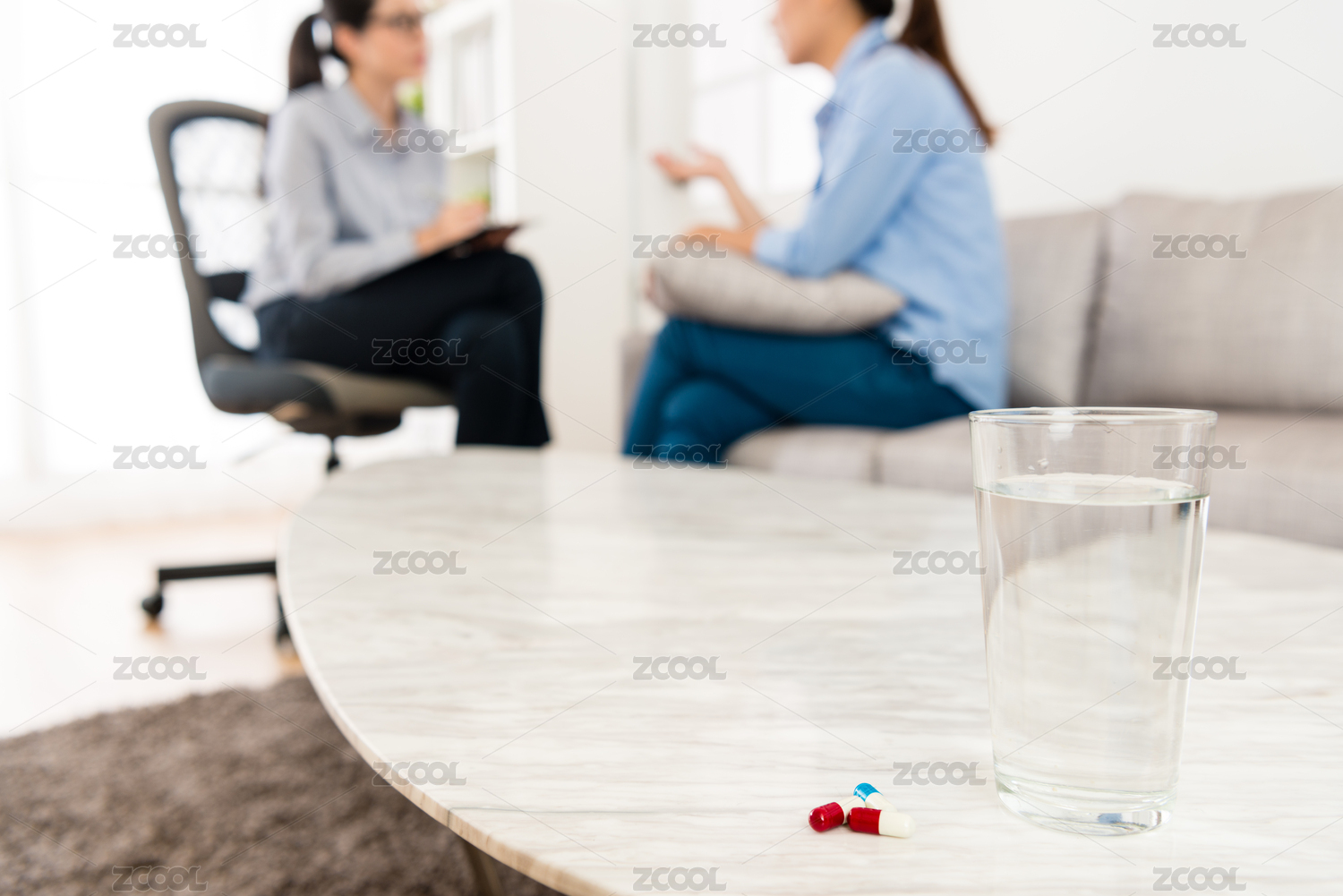 年輕的女孩沮喪抱怨糟糕的事情對(duì)她心理醫(yī)生的背景。選擇重點(diǎn)照片。藥物治療的概念。