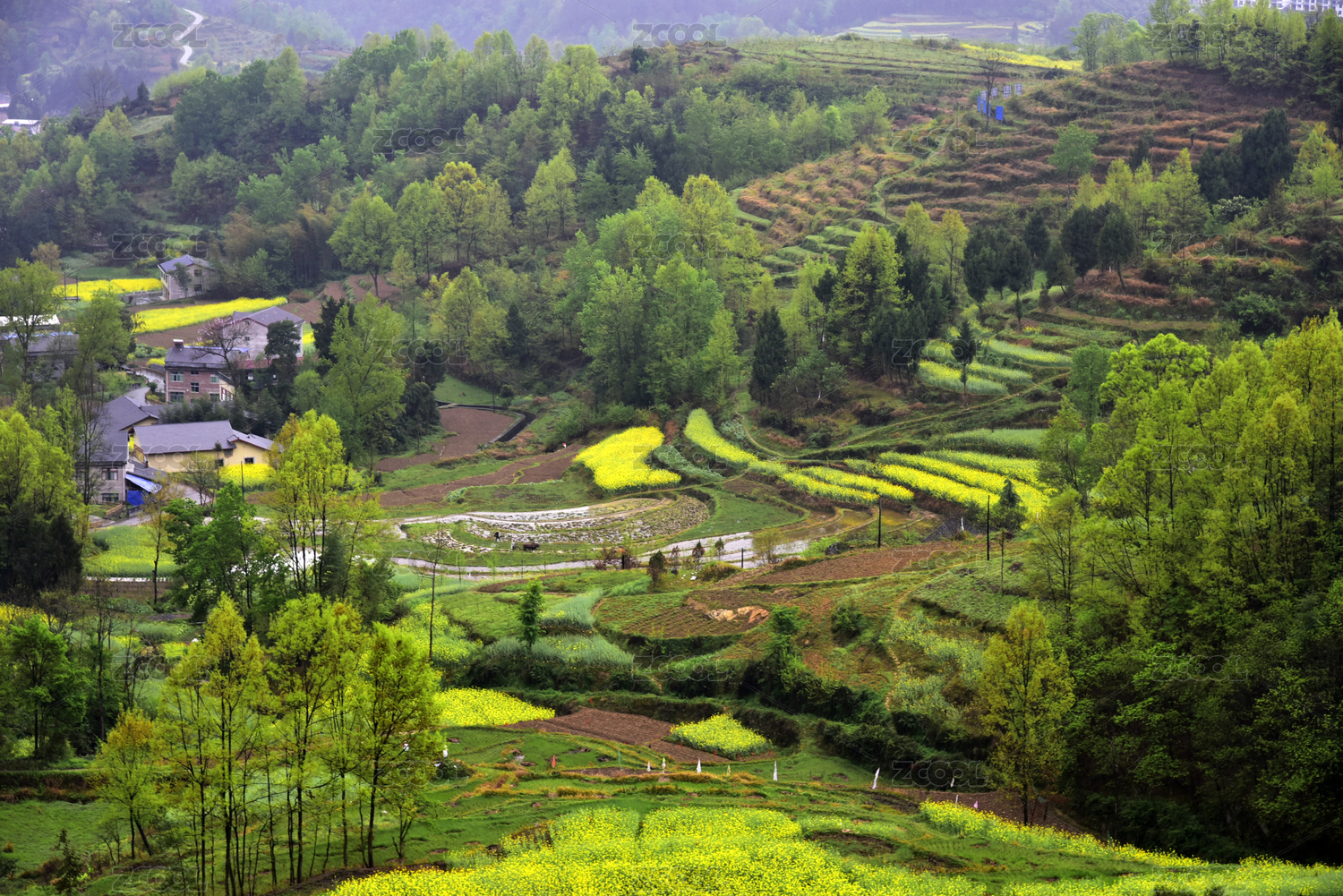 陜西安康市鳳堰古梯田村莊春天油菜花田