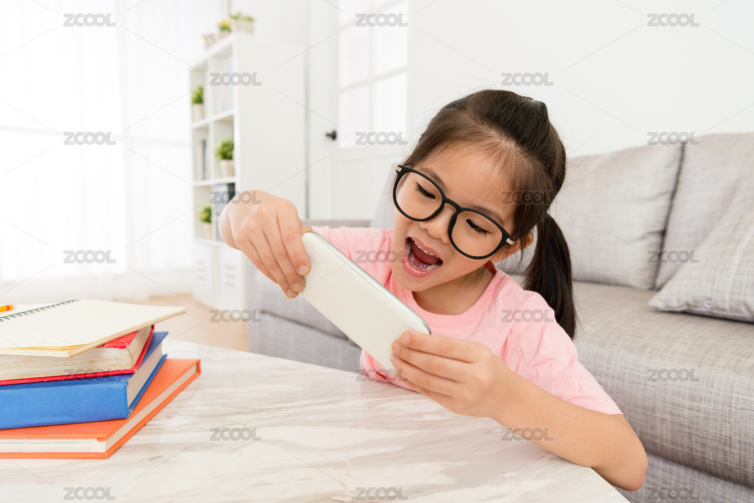 開(kāi)朗可愛(ài)的小女孩使用移動(dòng)智能手機(jī)玩在線(xiàn)視頻游戲時(shí),她長(zhǎng)假期間在家里完成作業(yè)。
