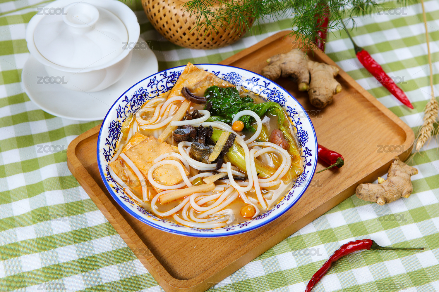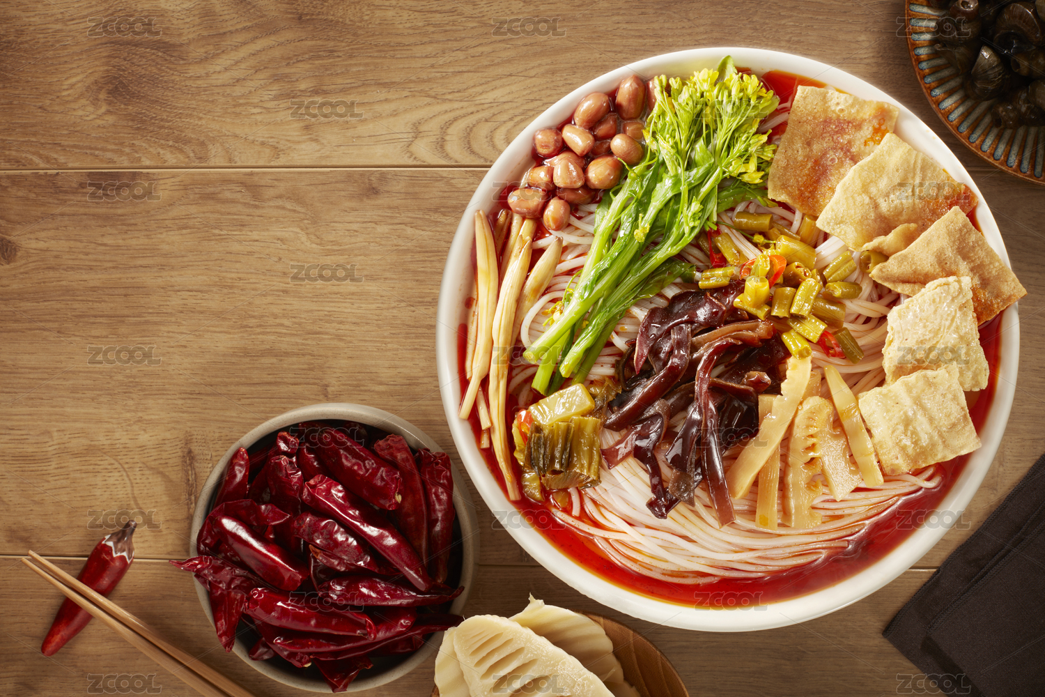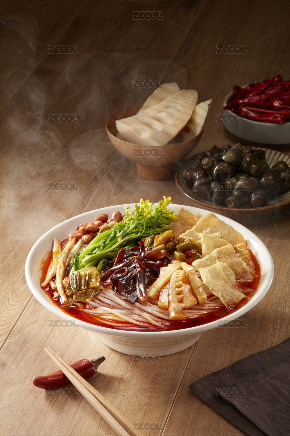 美味的廣西柳州螺螄粉,在木質(zhì)的桌面背景