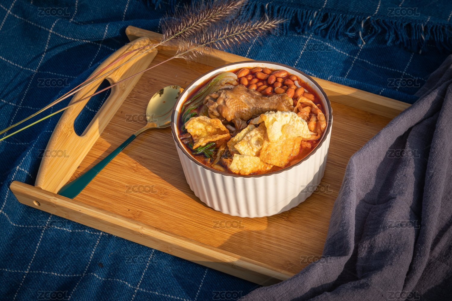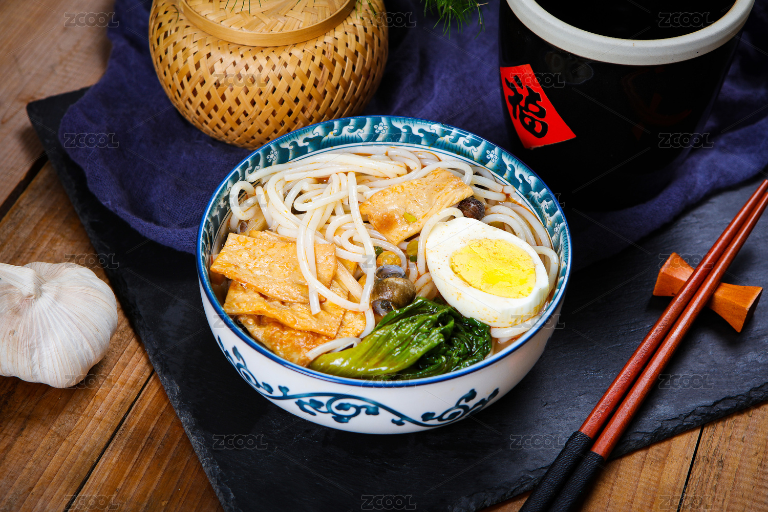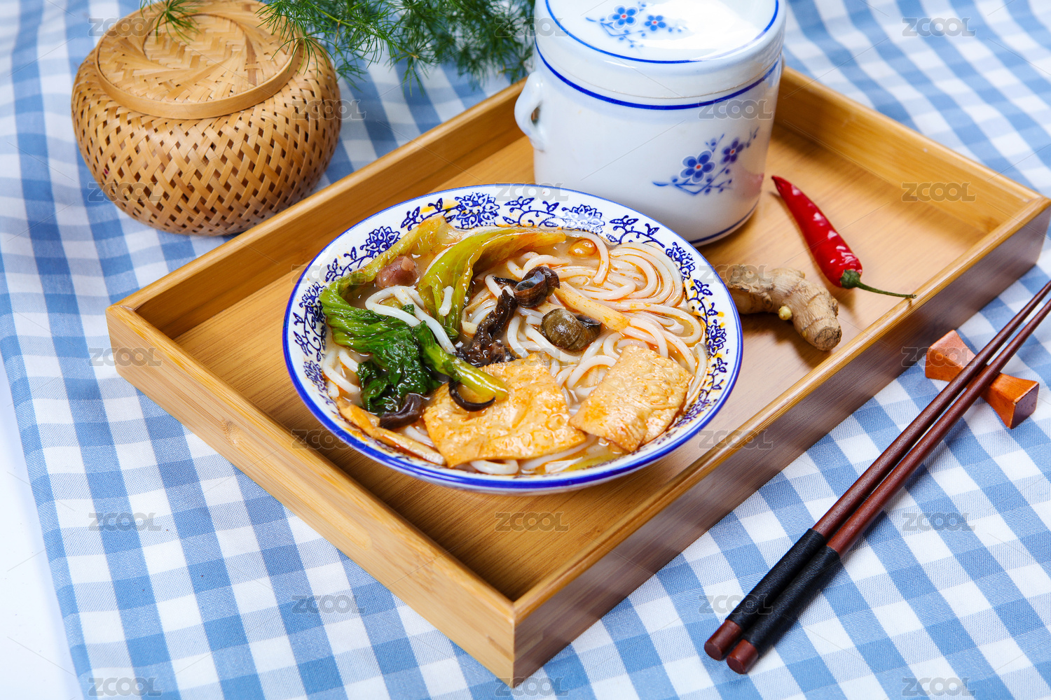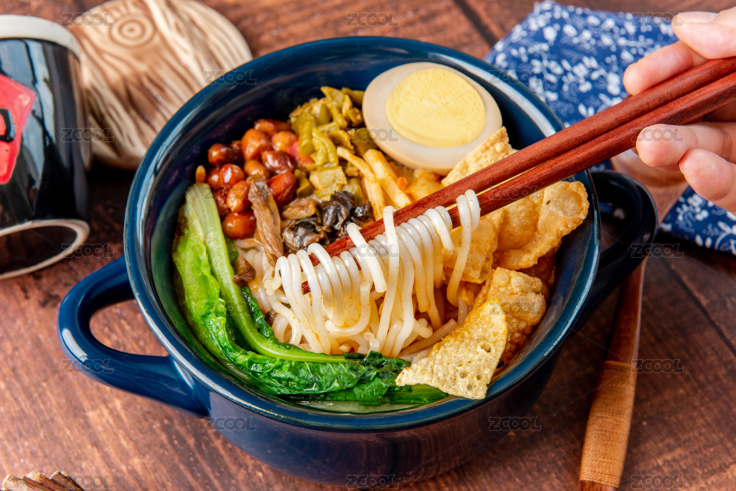 美味的廣西柳州螺螄粉,在木質(zhì)的桌面背景