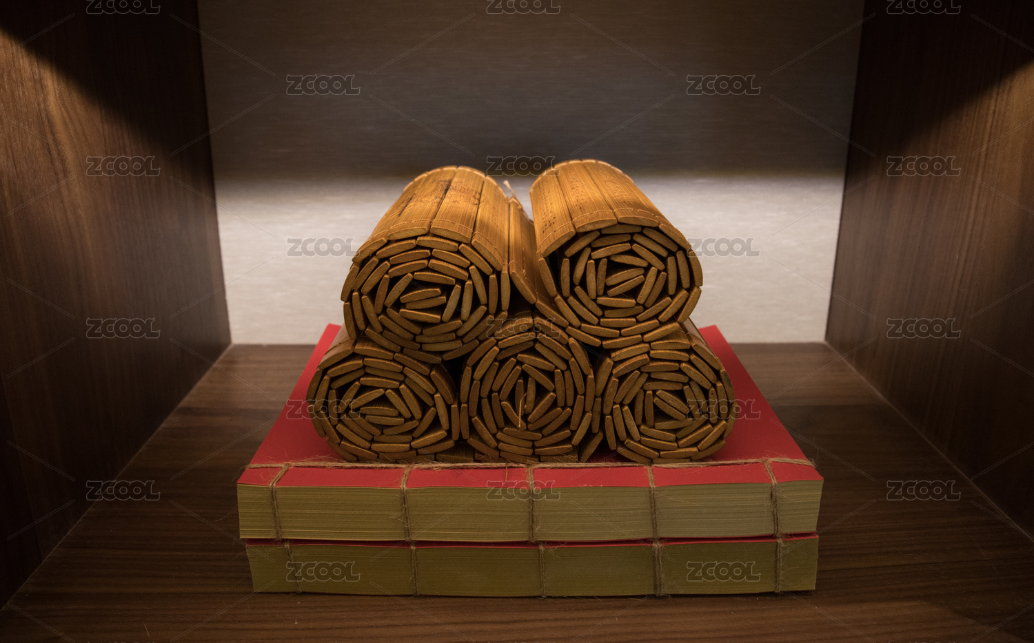 書柜中紅色線裝書上放著六個竹簡
