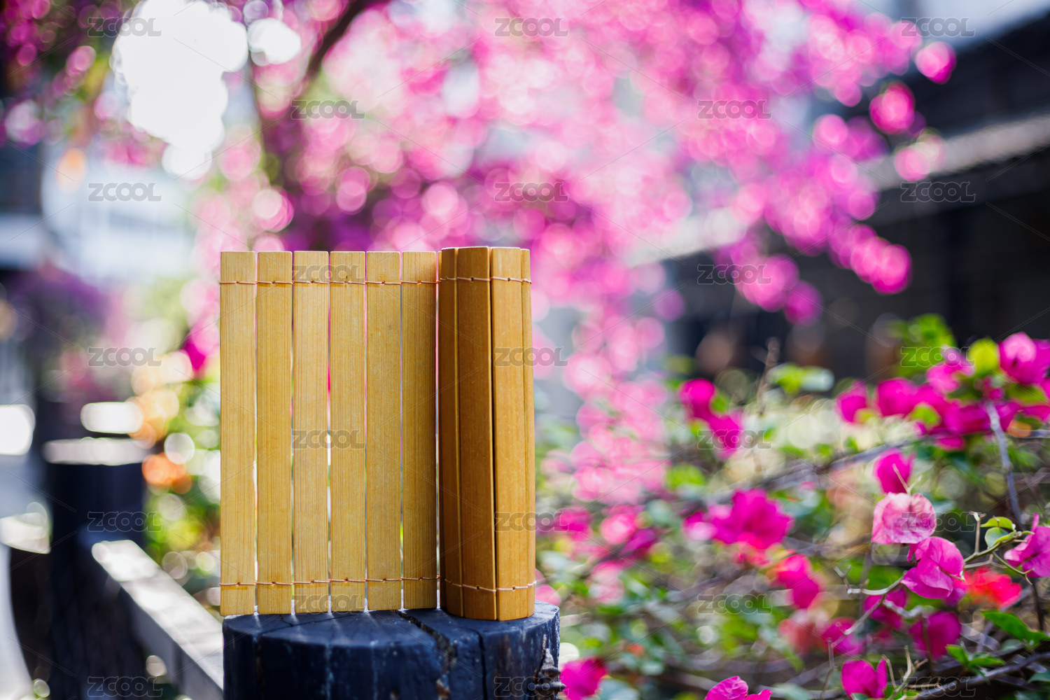 木樁上的一冊空白竹簡,背景是虛化的花朵