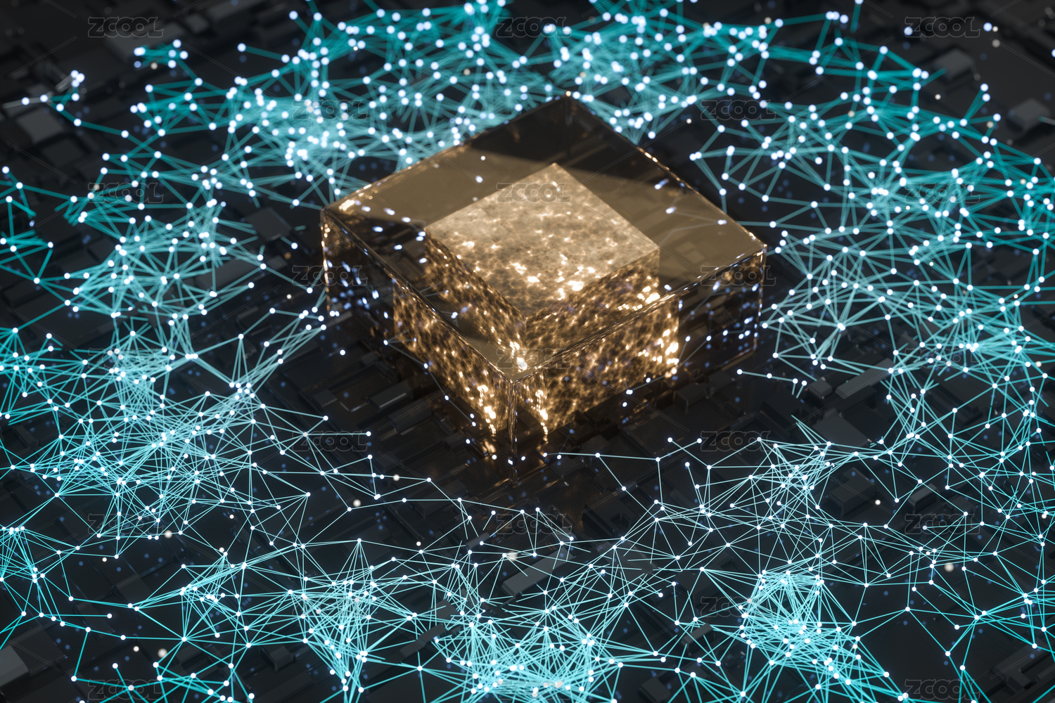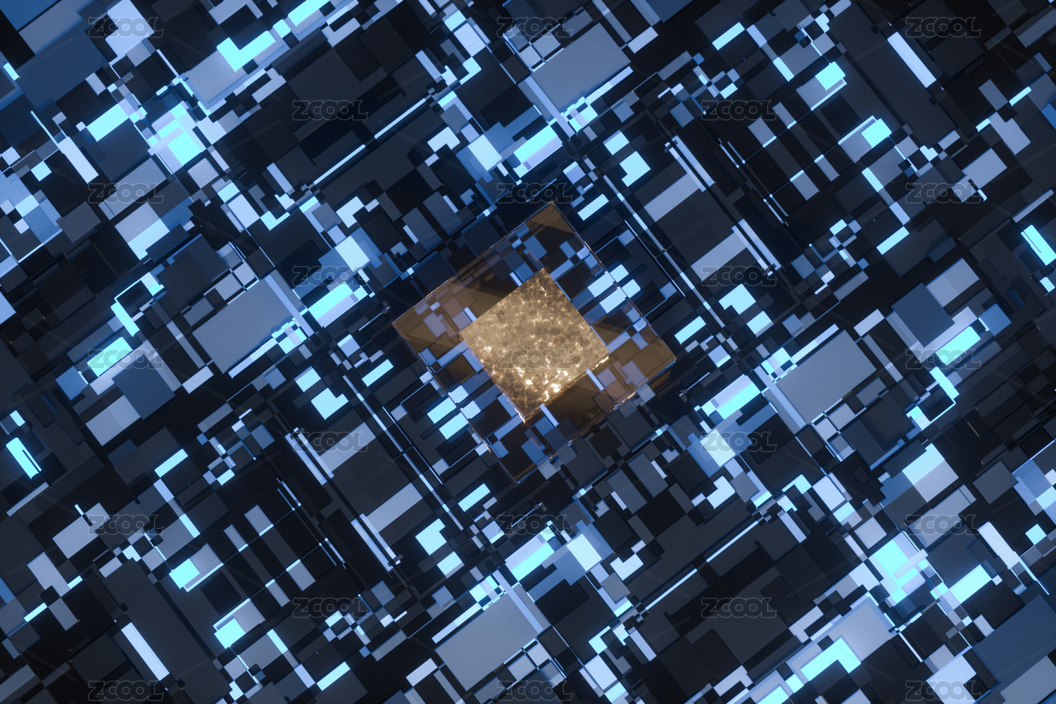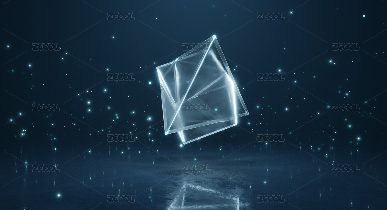 發(fā)光透明立方體模塊與發(fā)光粒子深藍(lán)色背景