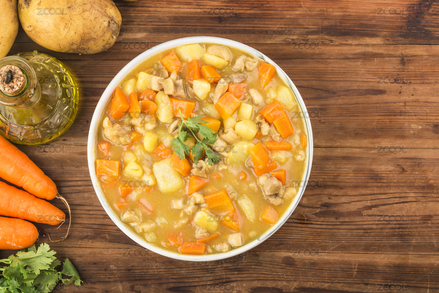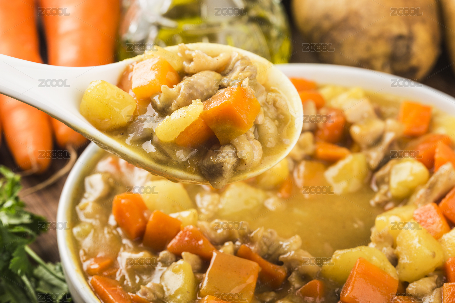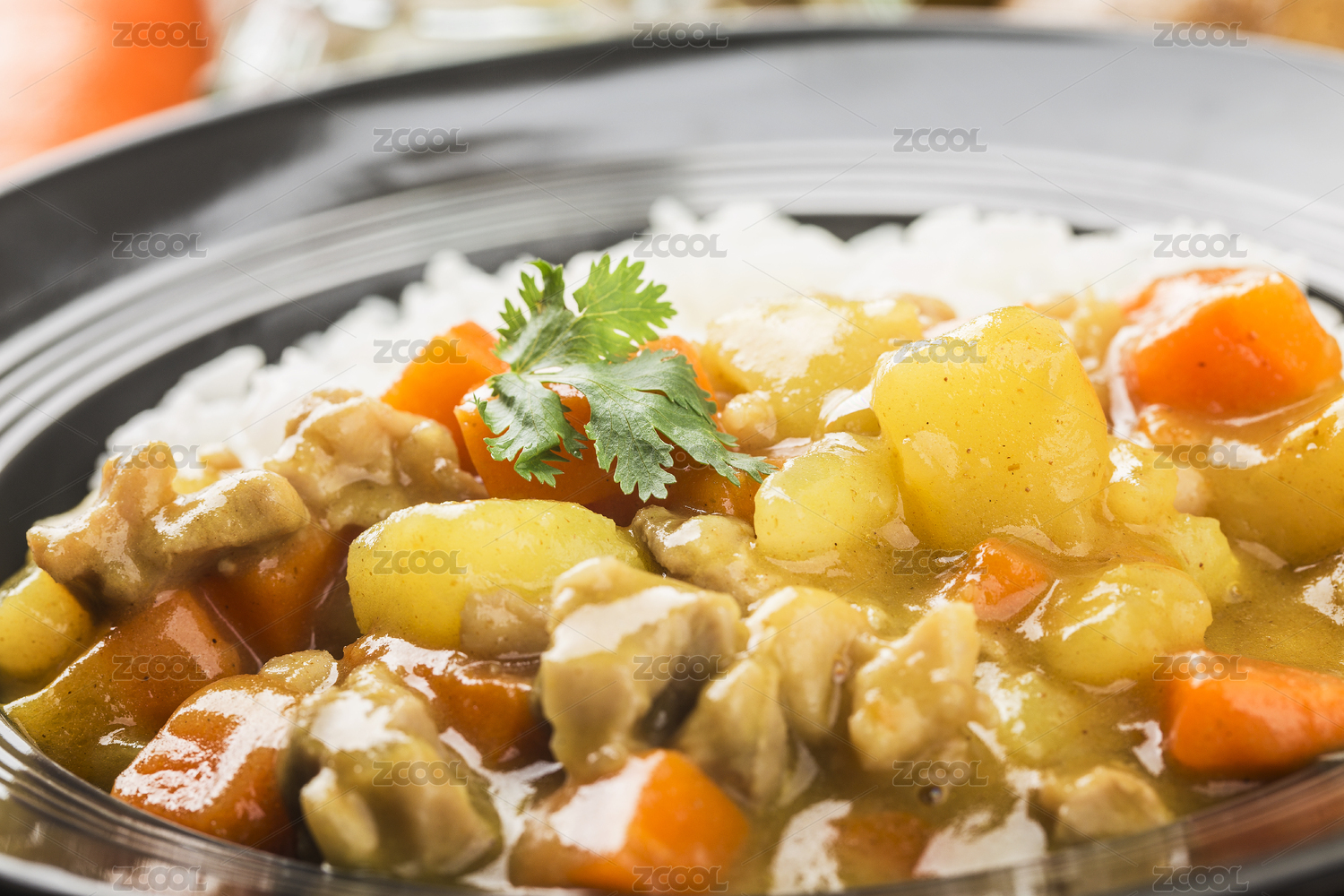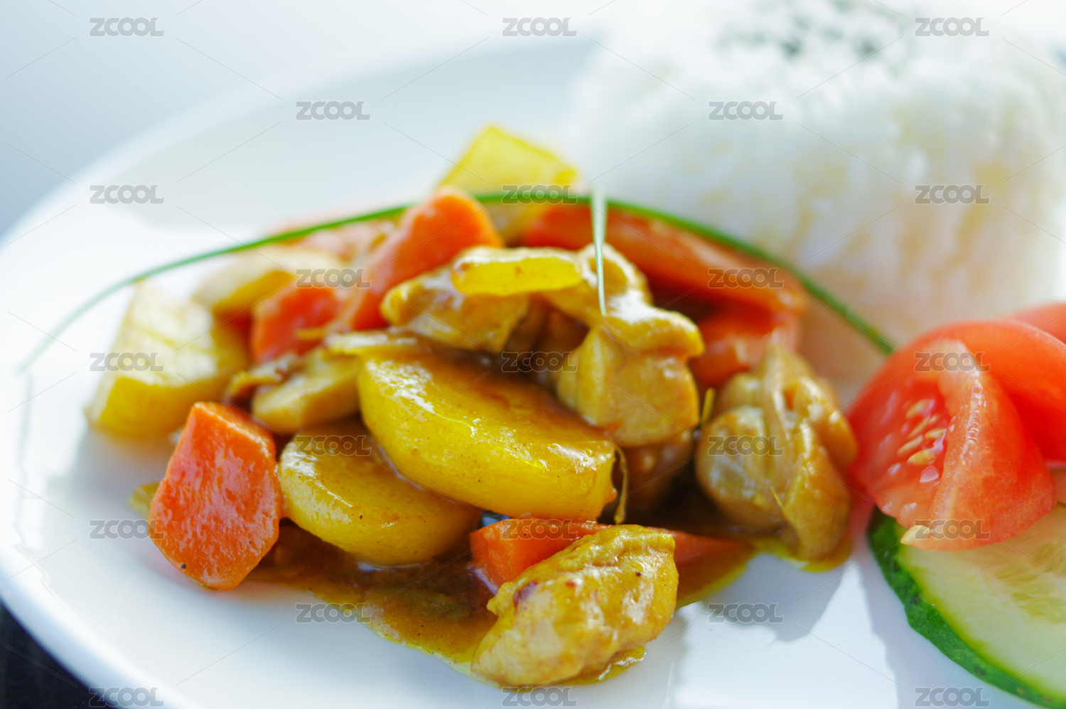 咖喱雞肉飯配土豆胡蘿卜西紅柿黃瓜特寫