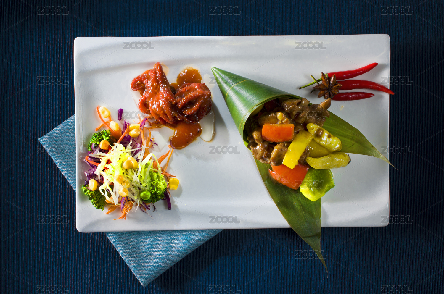 俯拍白色方瓷盤中的咖喱雞肉沙拉