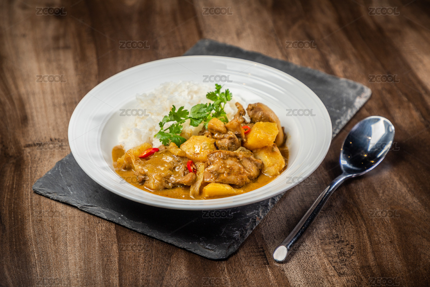 棕色木紋桌上放著一盤咖喱雞肉米飯