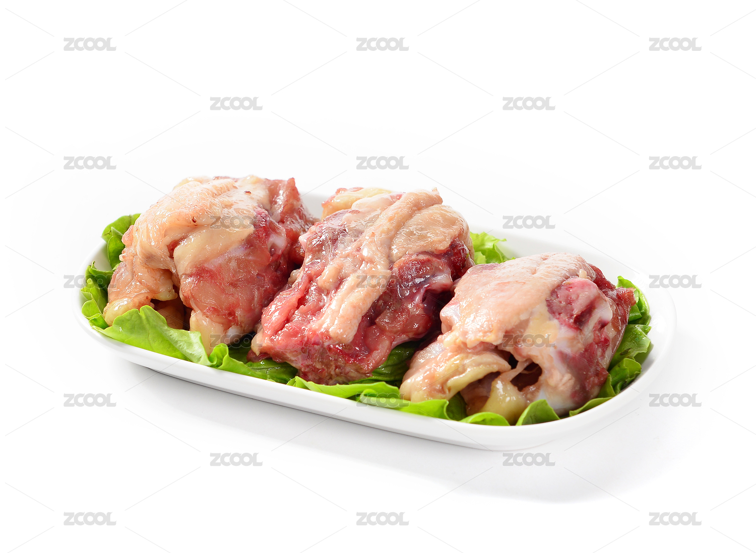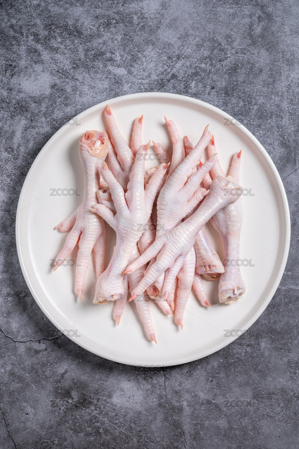 水泥背景上白色盤子里的生雞爪