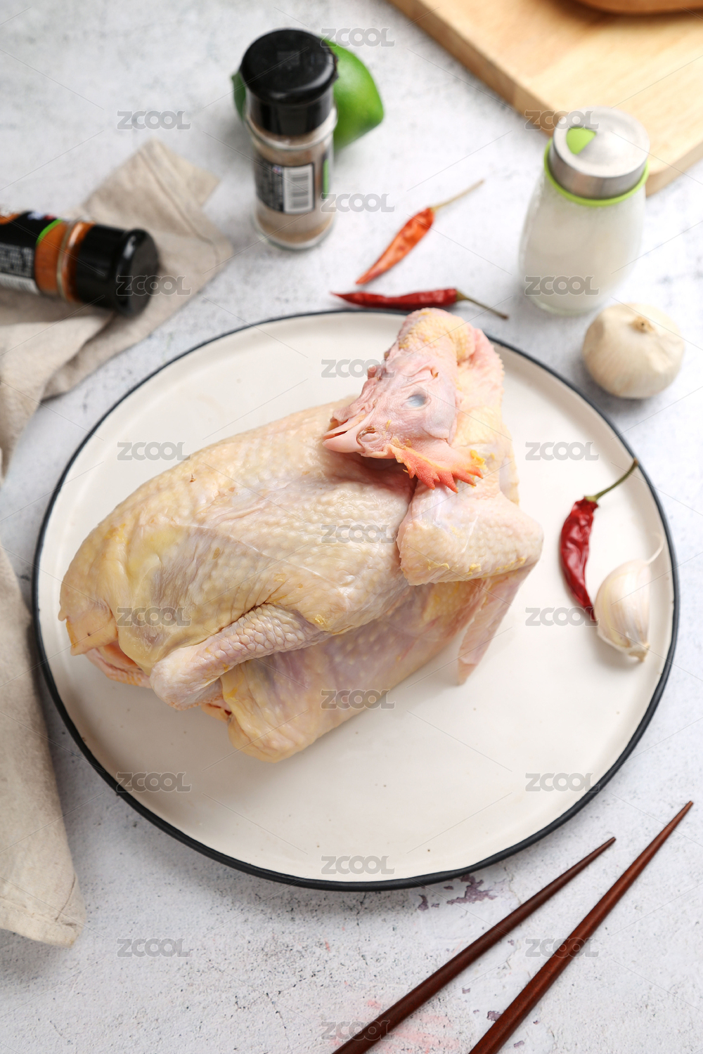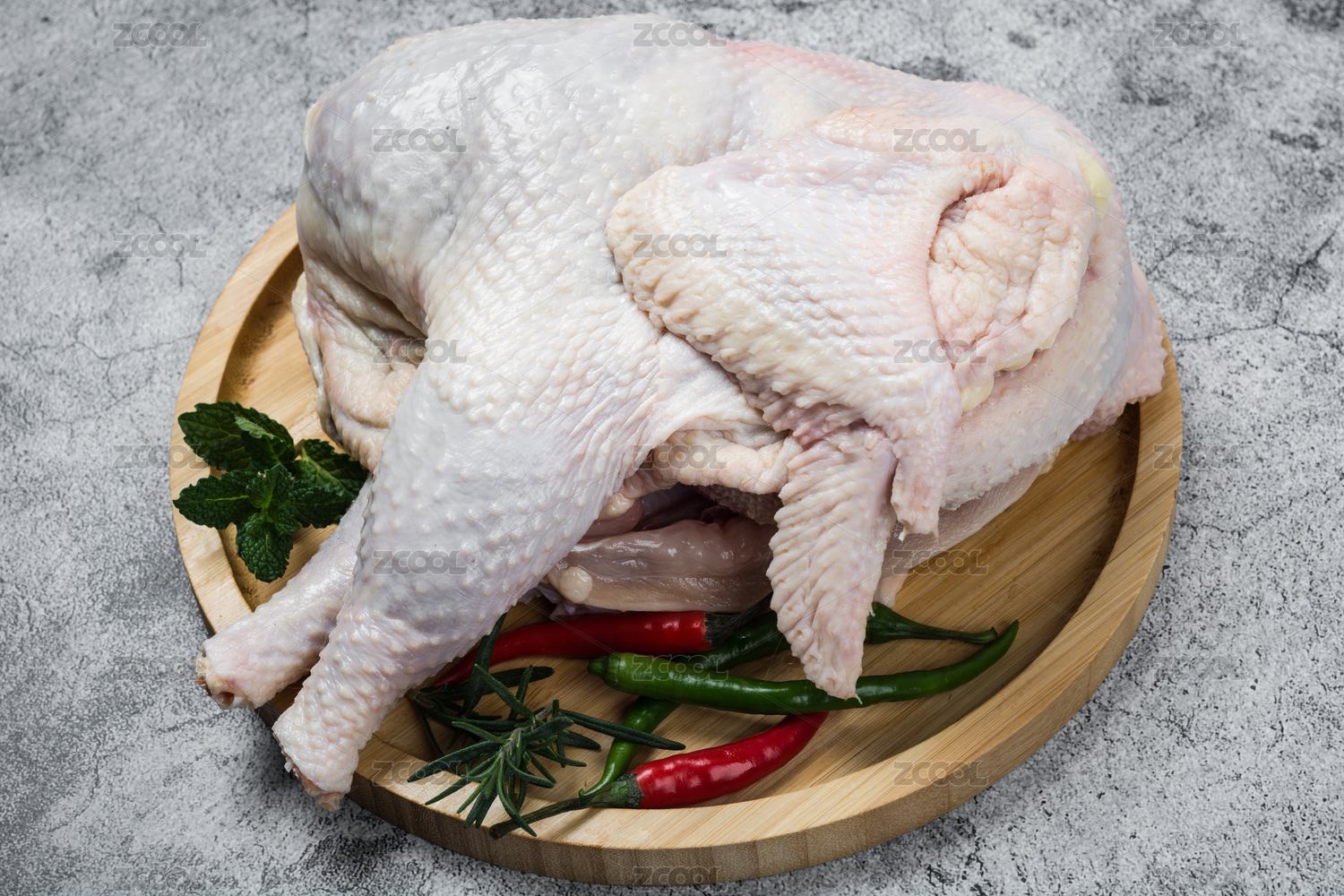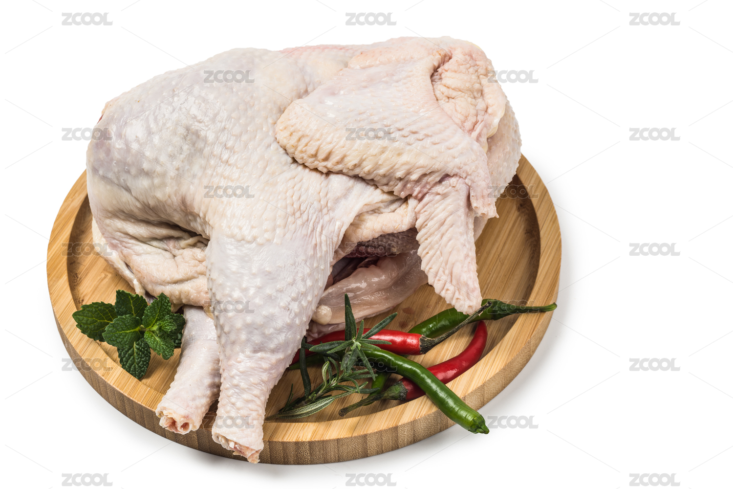 木質(zhì)圓形托盤上的整塊生雞,白色背景