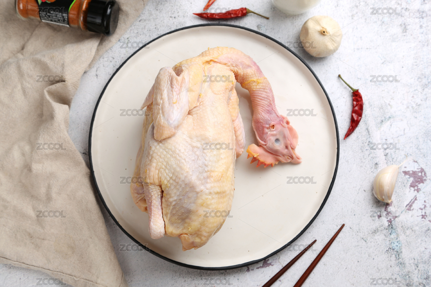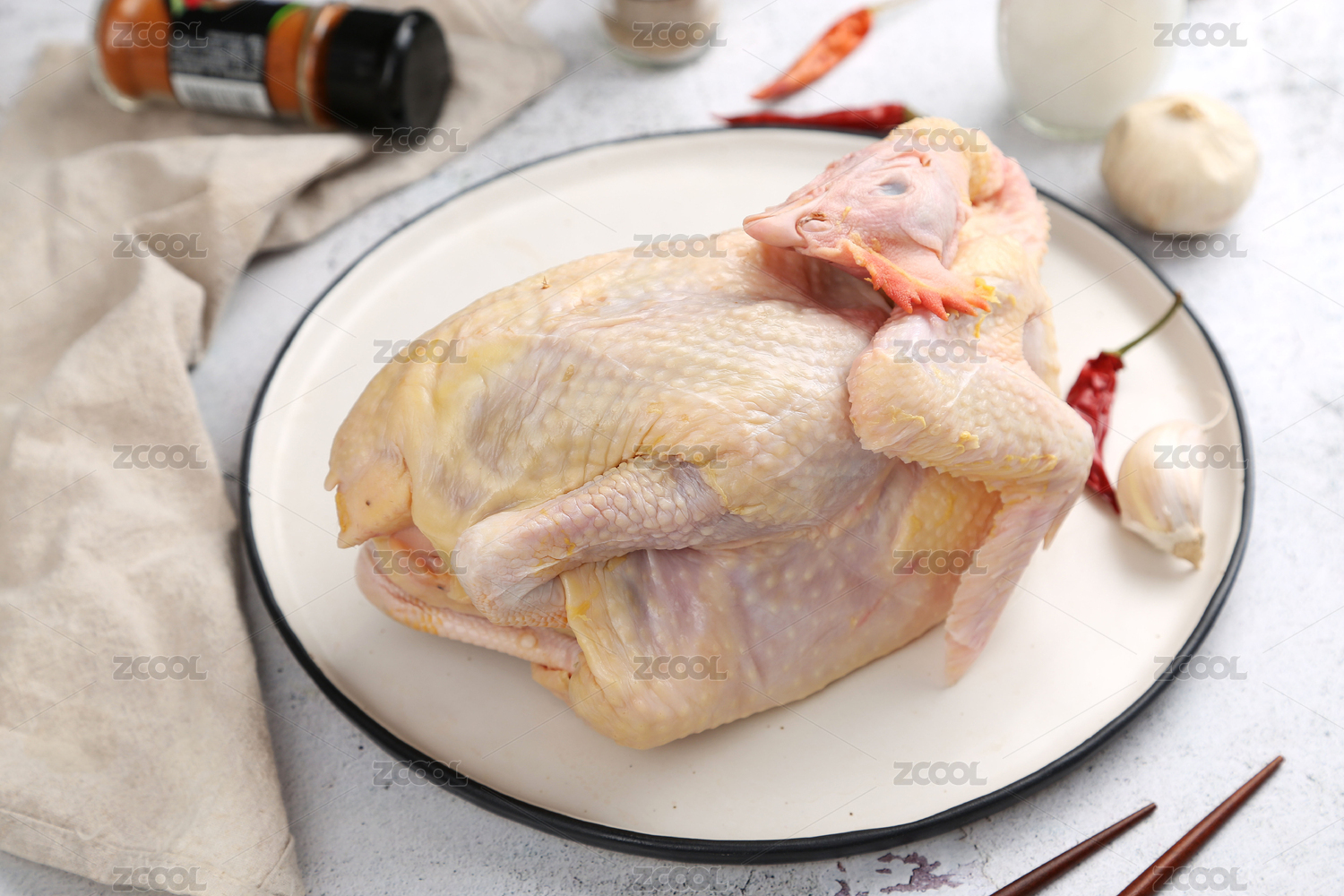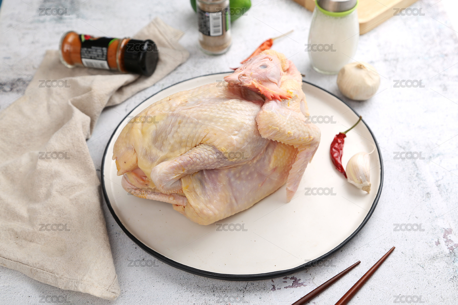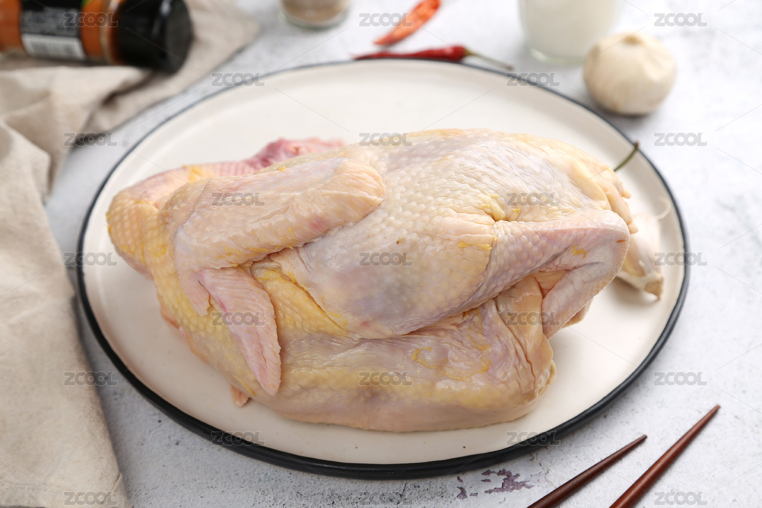 木質(zhì)圓形托盤上的整塊生雞,白色背景