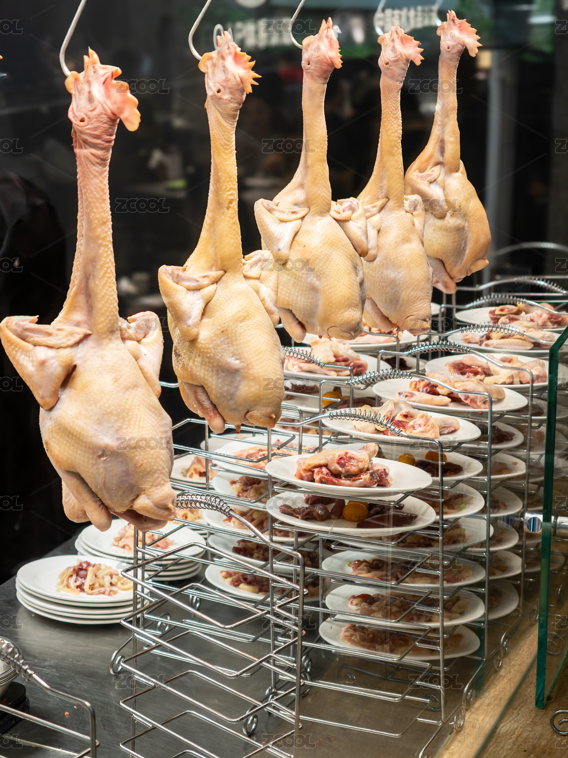 中式雞肉火鍋餐廳櫥窗里懸掛著新鮮的生雞