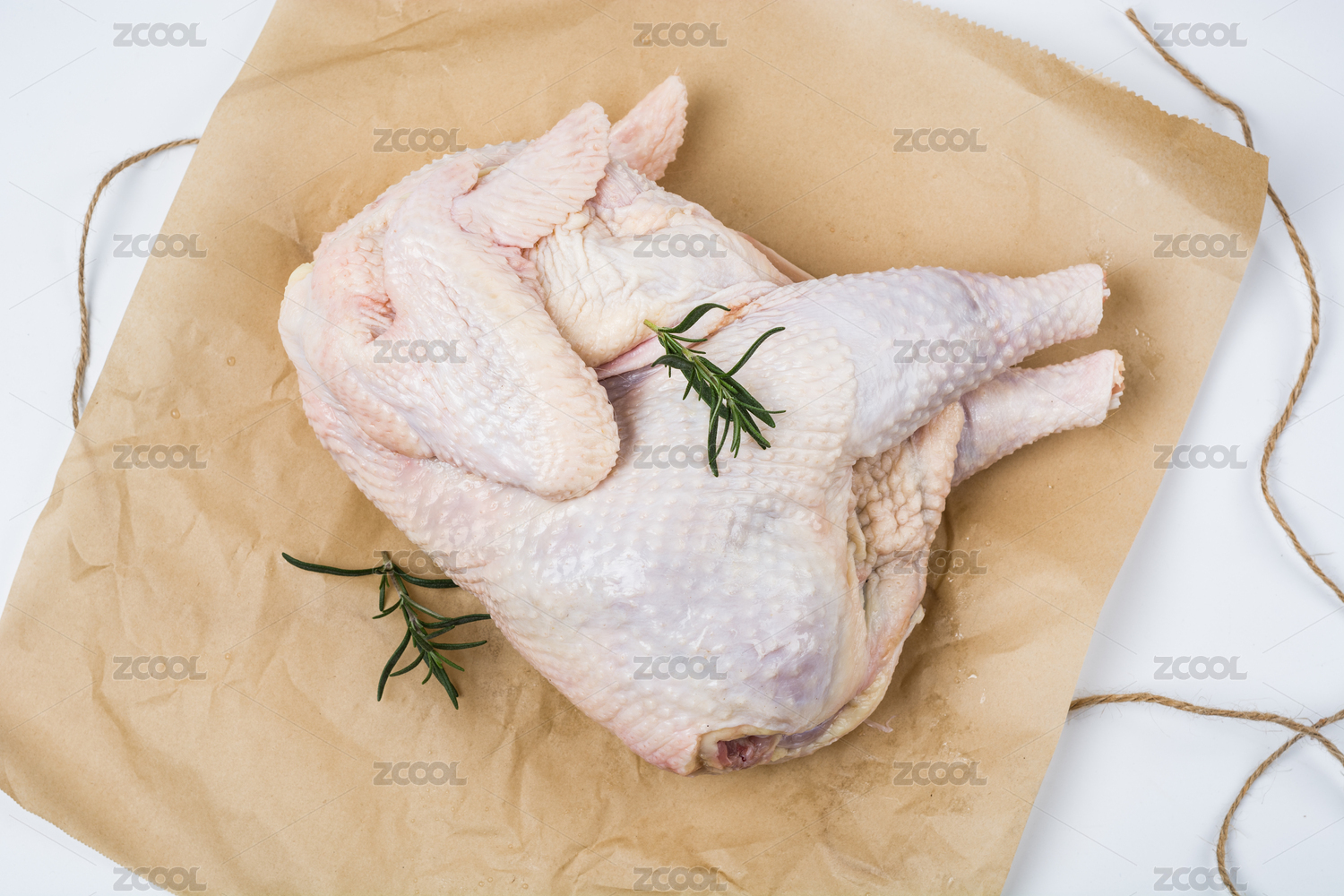 木色油紙上的整塊生雞,白色背景