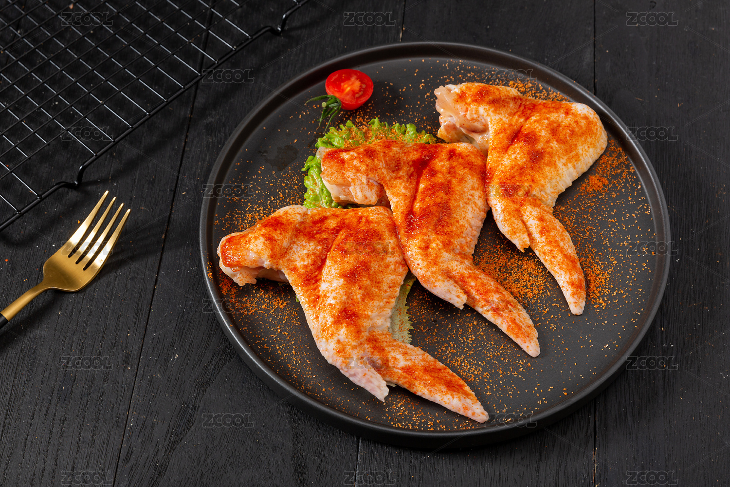 盤子里撒了燒烤料的生雞全翅食材