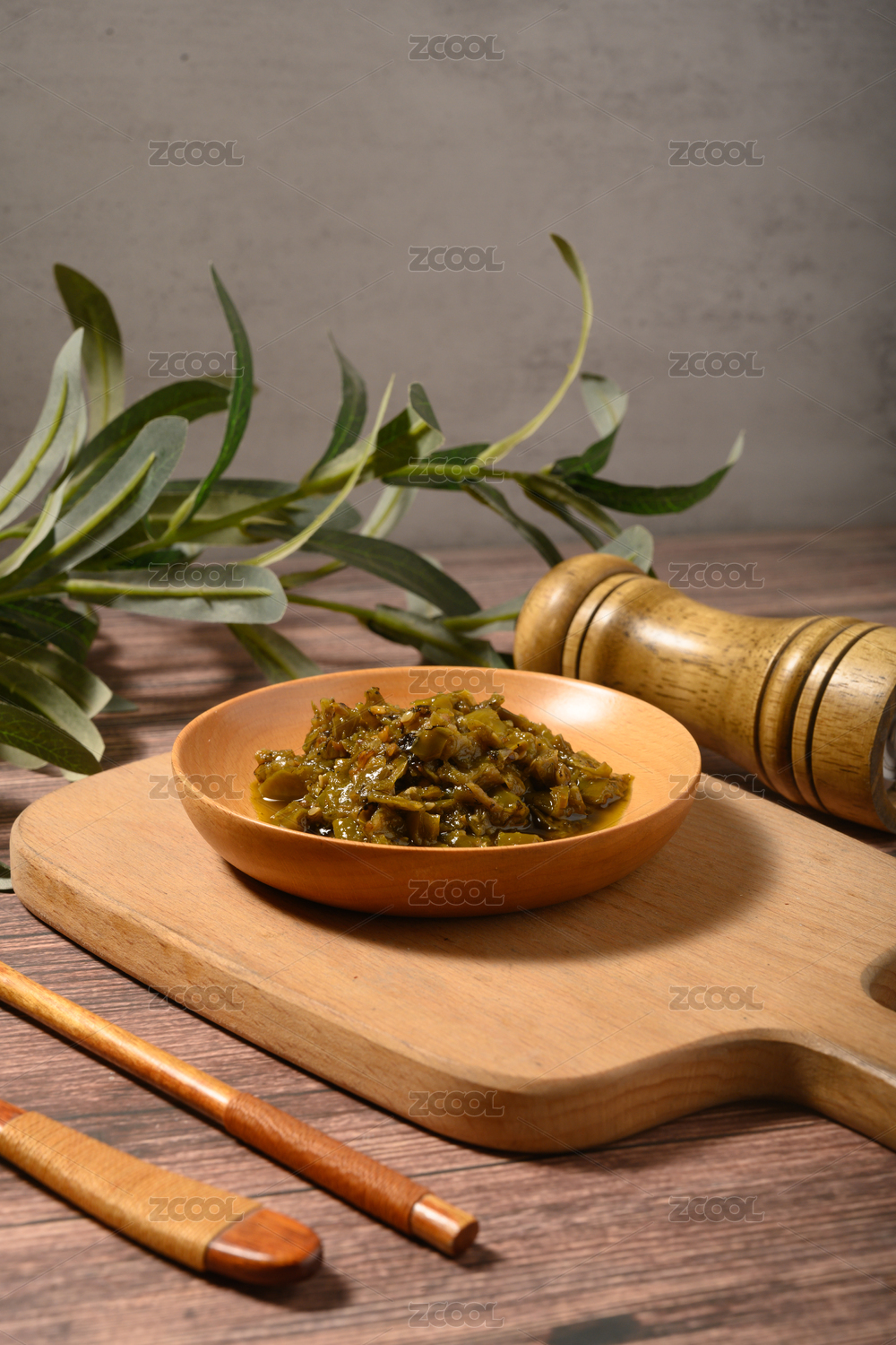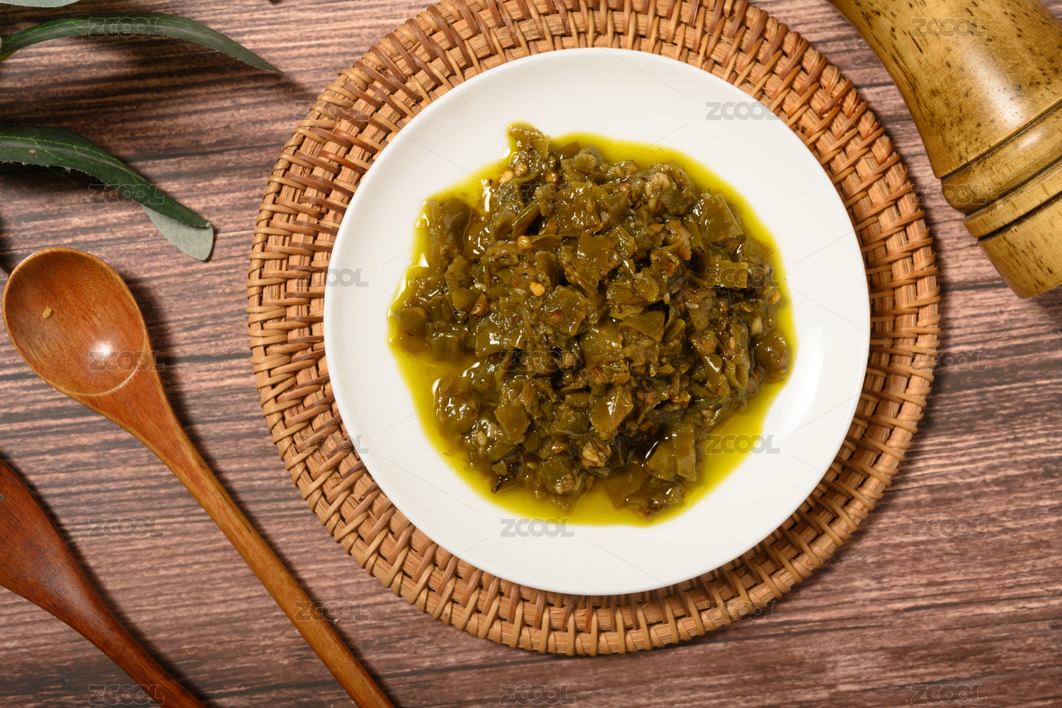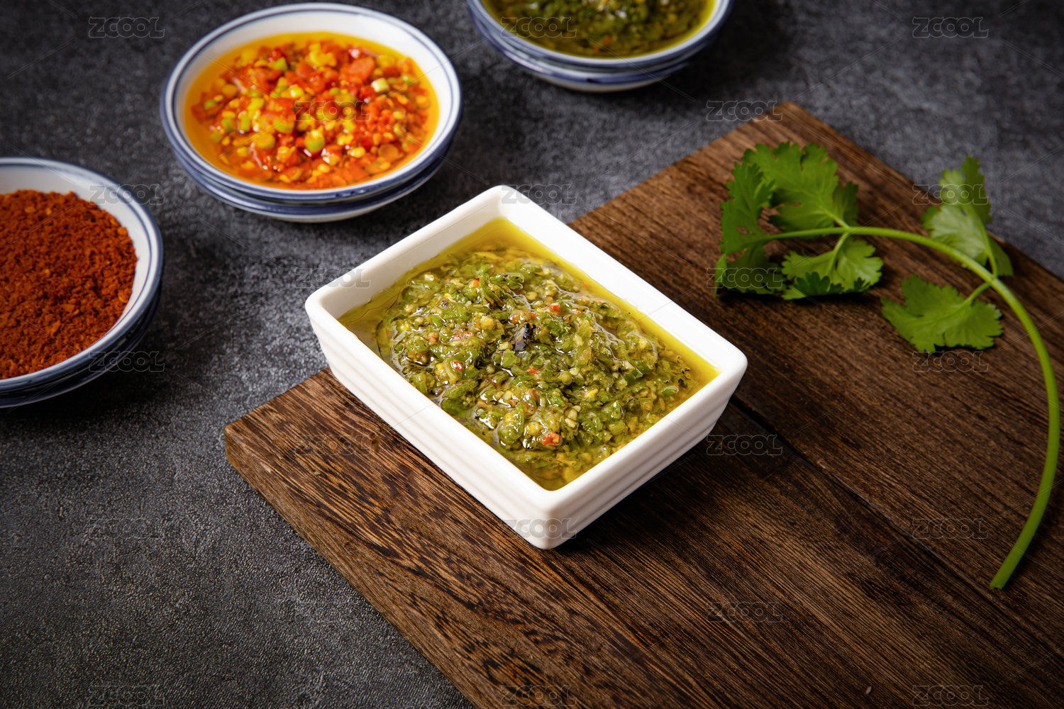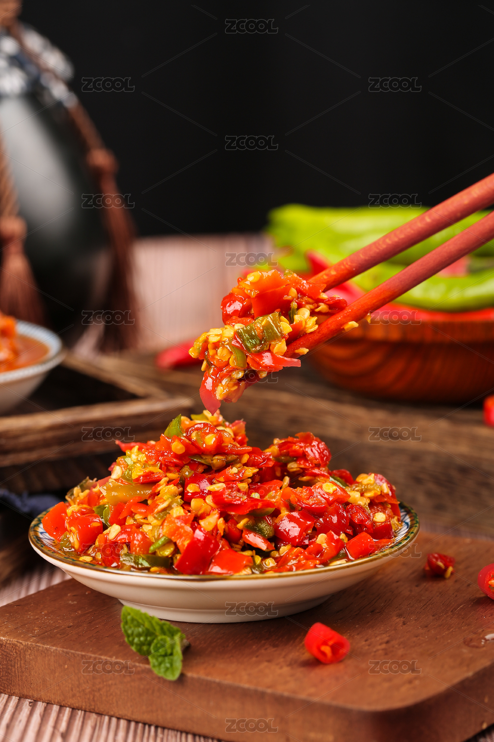 木板上放著一盤燒椒醬和筷子上夾著鮮椒醬