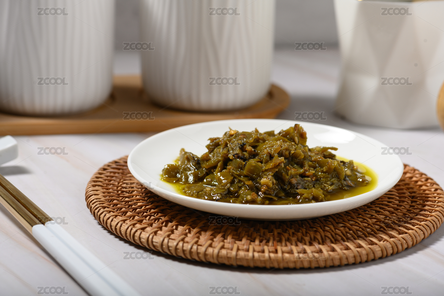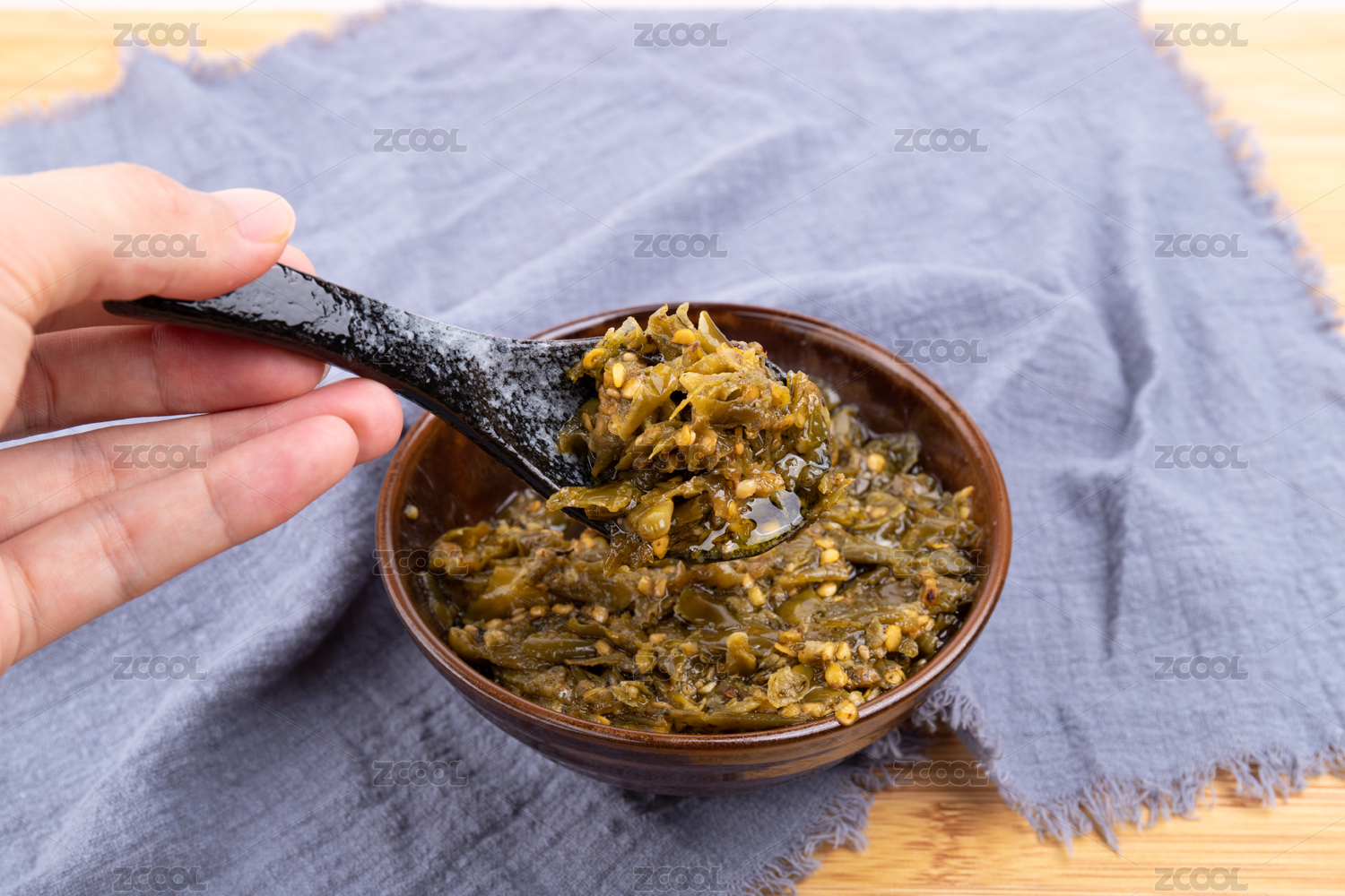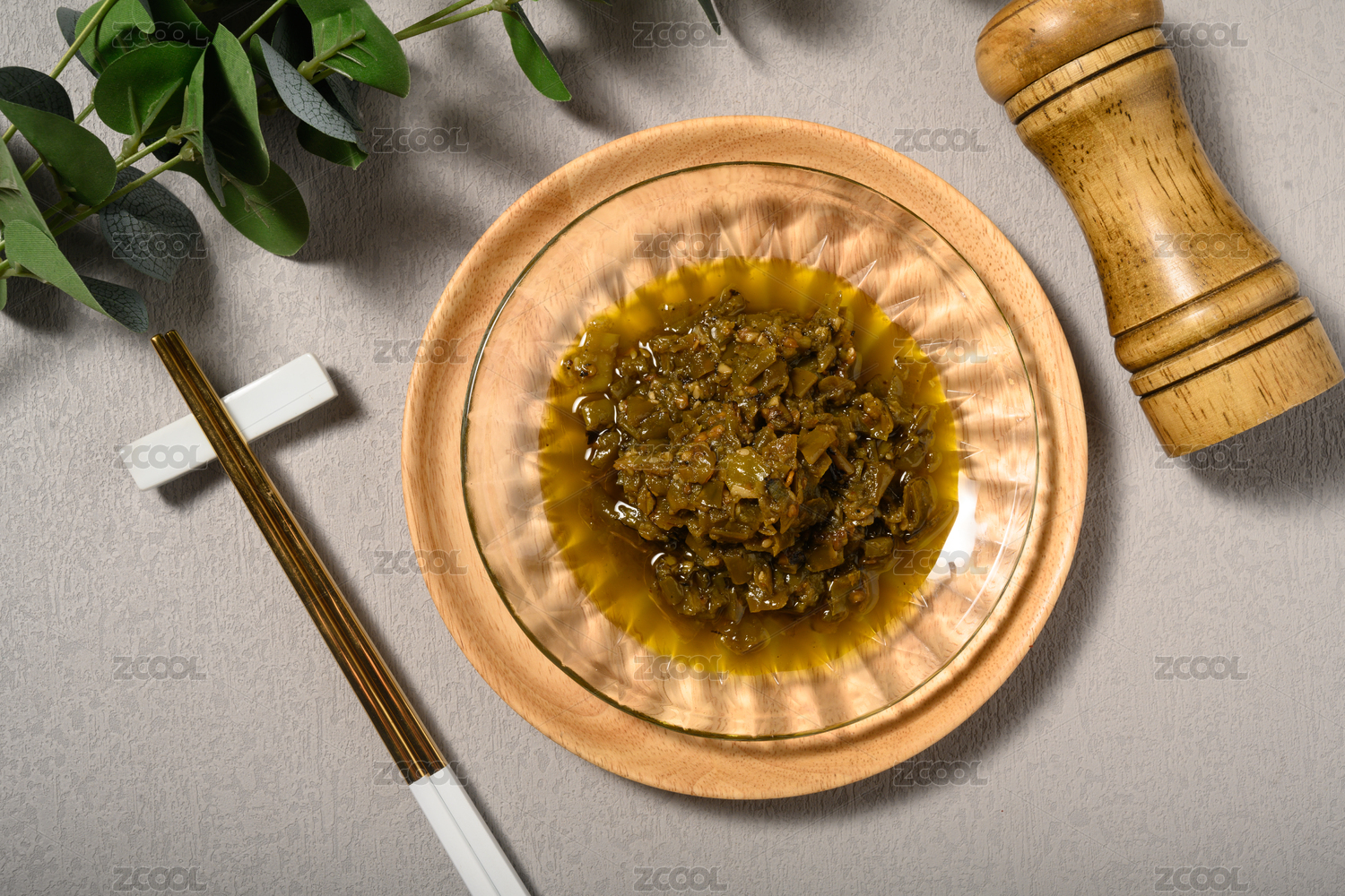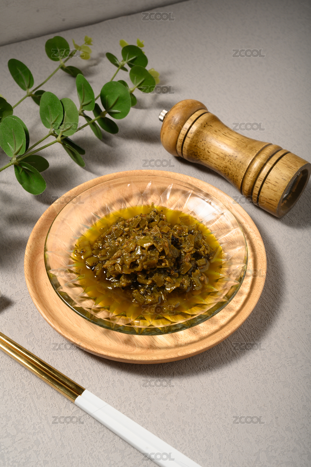 木板上放著一盤燒椒醬和筷子上夾著鮮椒醬