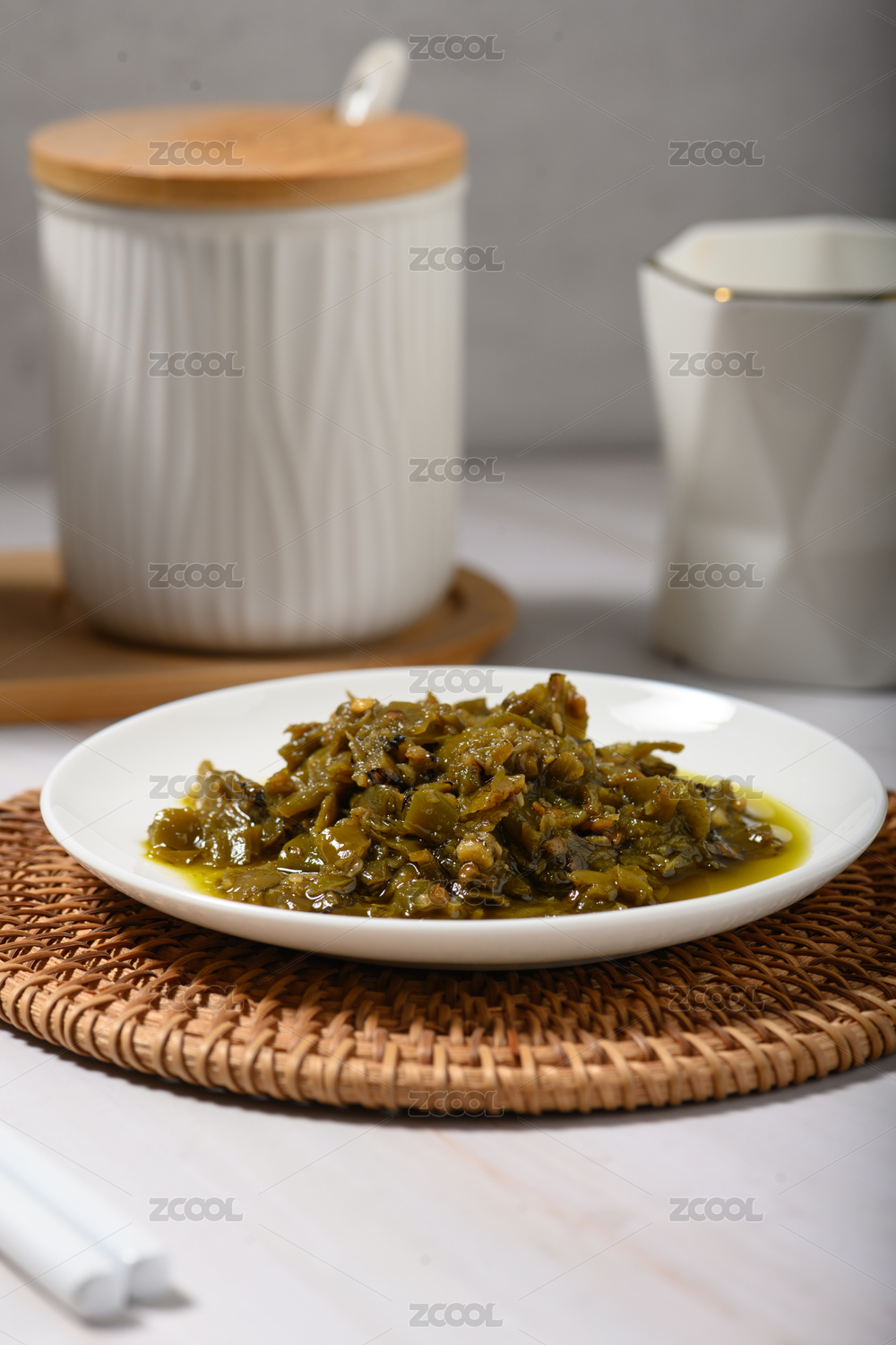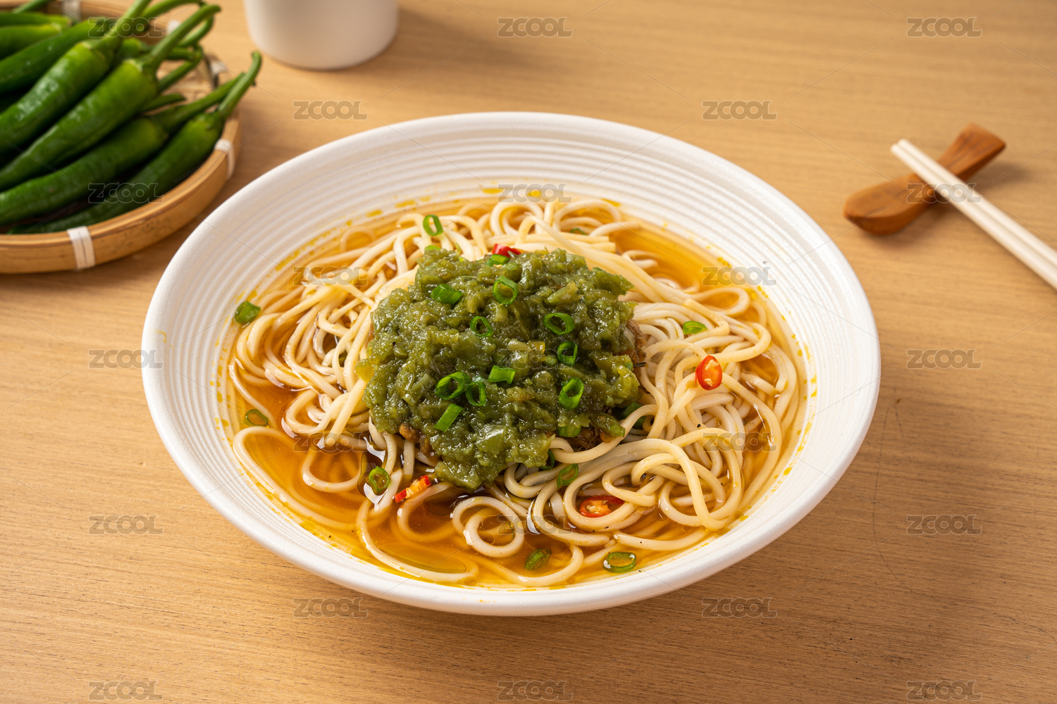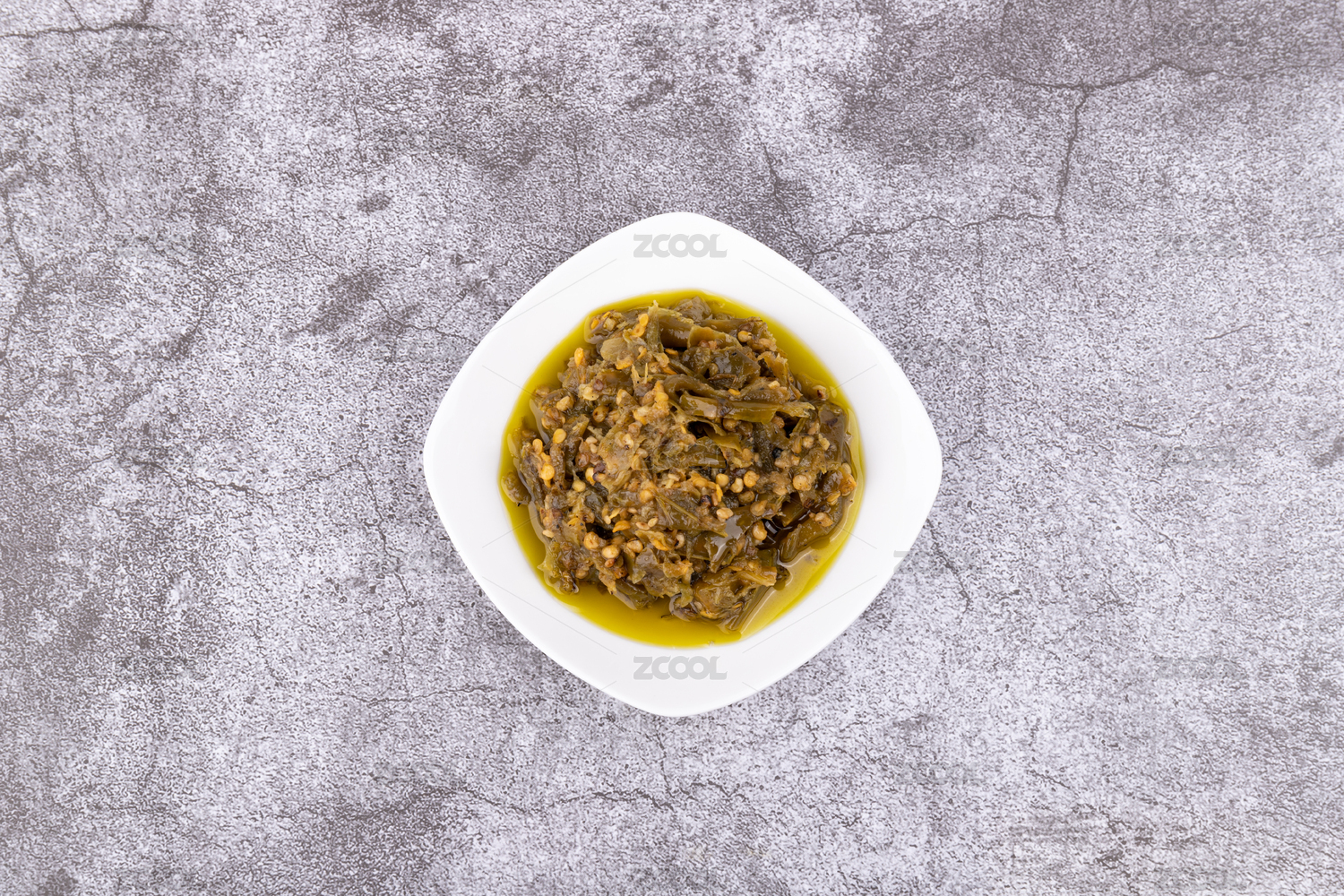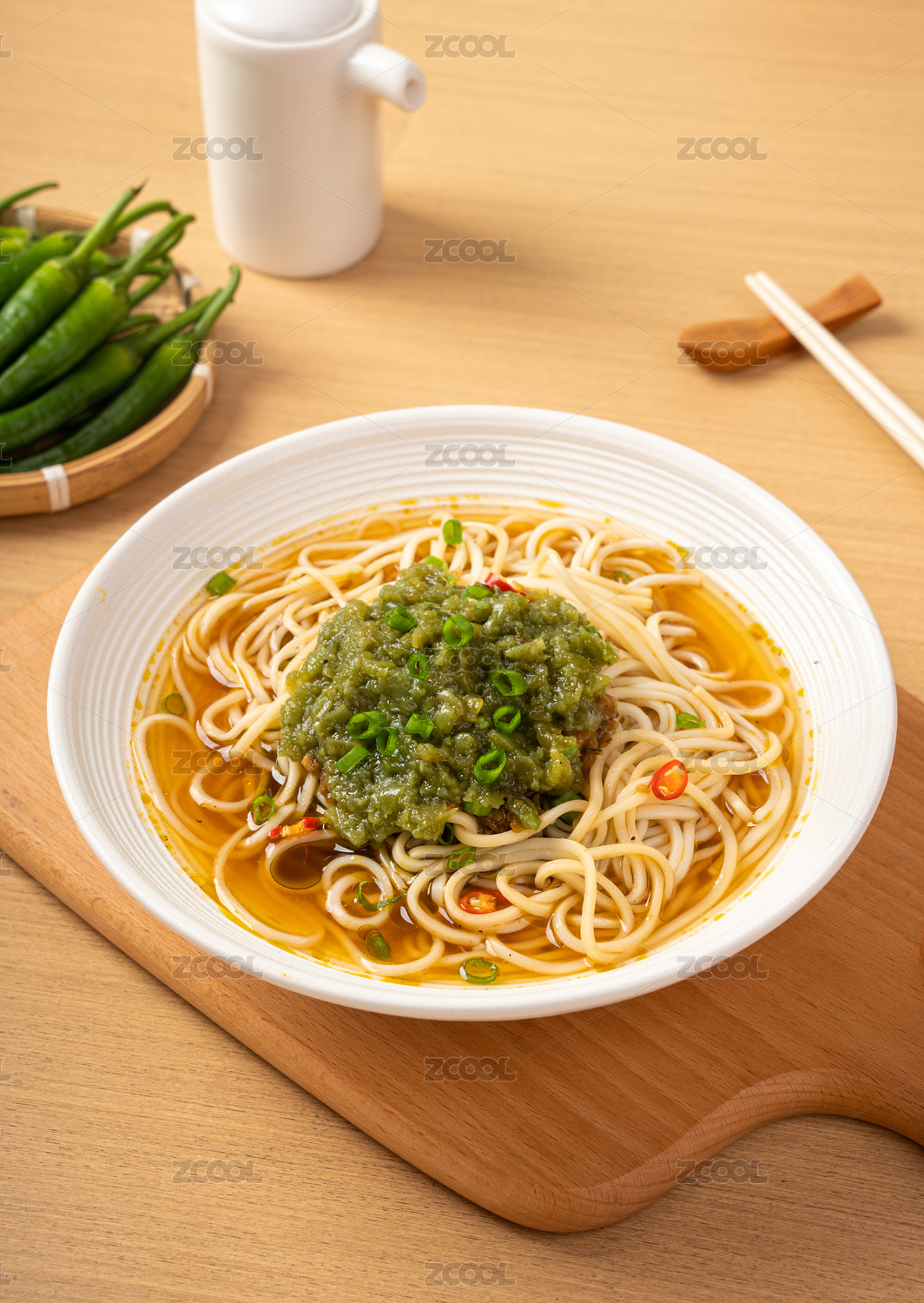 木板上放著一盤燒椒醬和筷子上夾著鮮椒醬