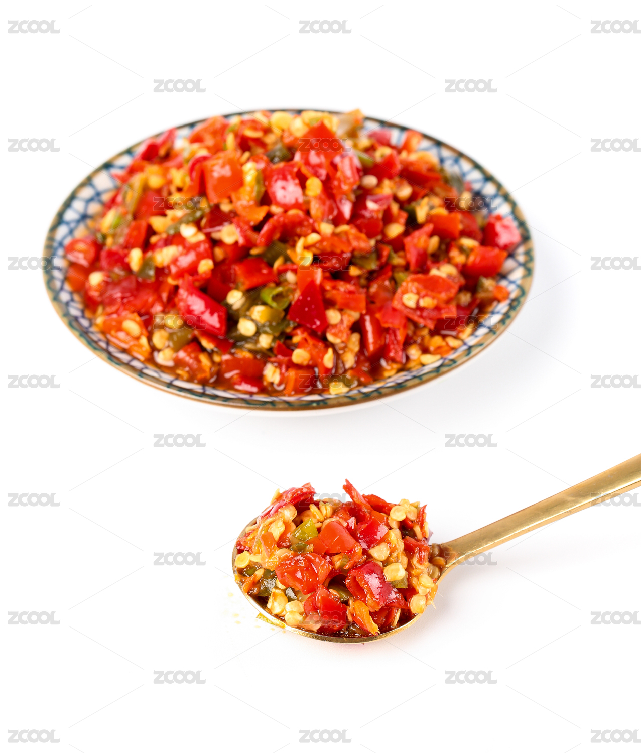 白底上放著一盤燒椒醬和一勺辣椒醬