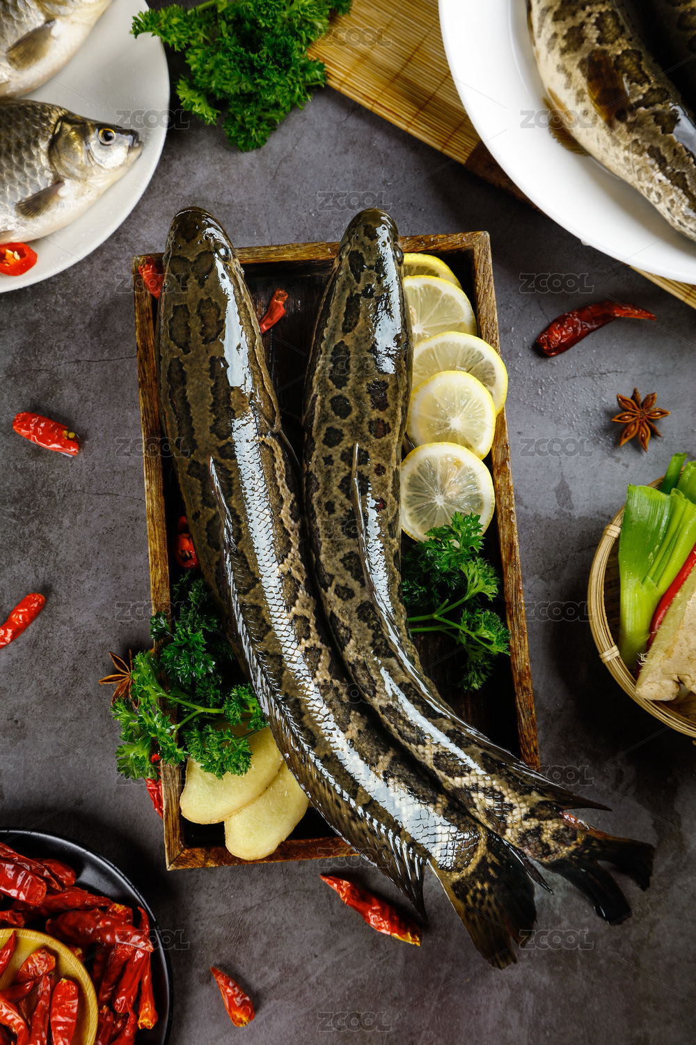 黑底上放著一條鮮活烏魚
