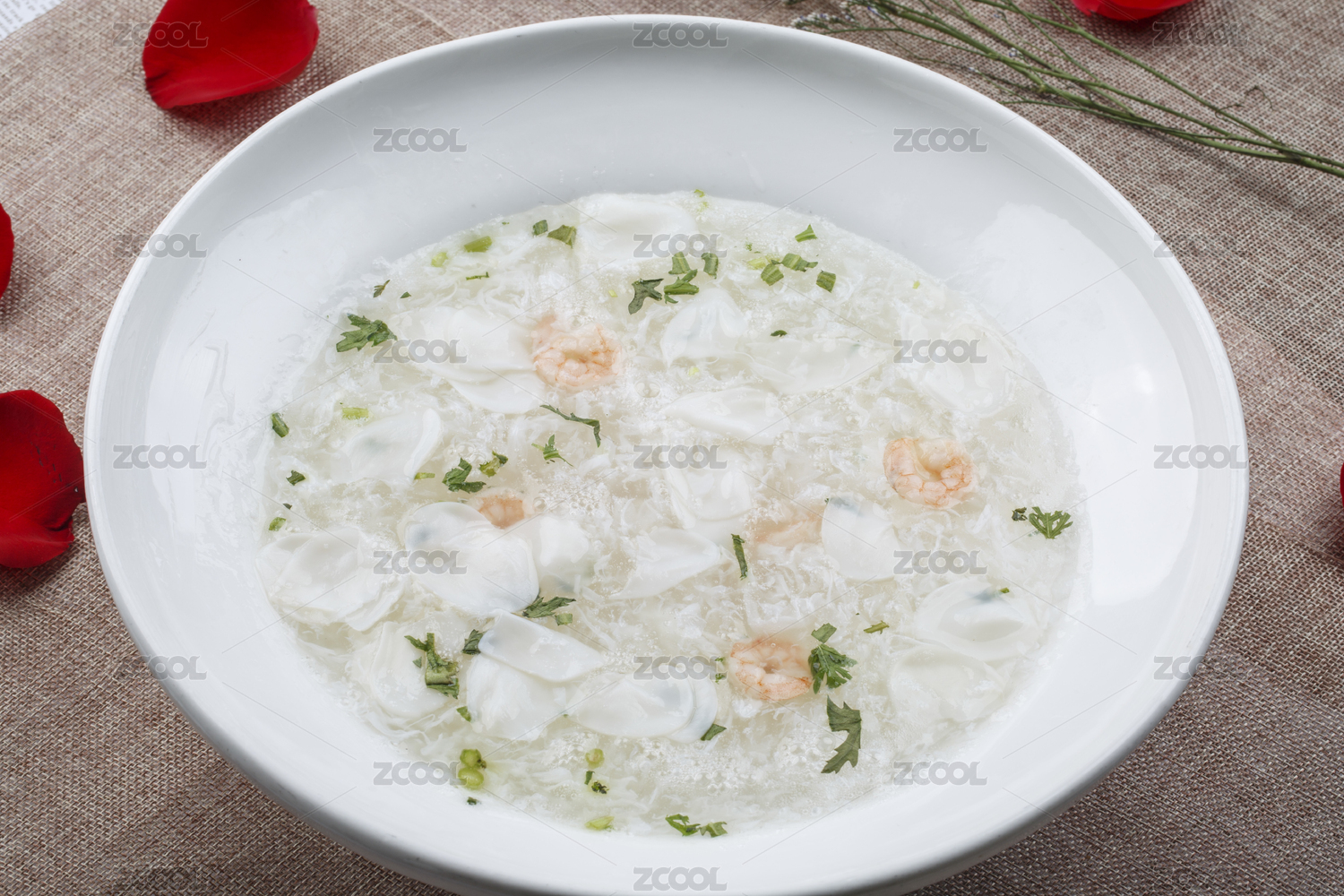 白色圓形湯瓷盆裝的烏魚蝦仁蛋花湯