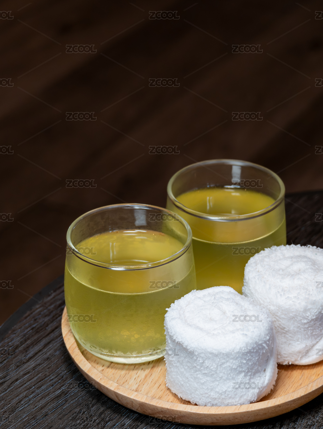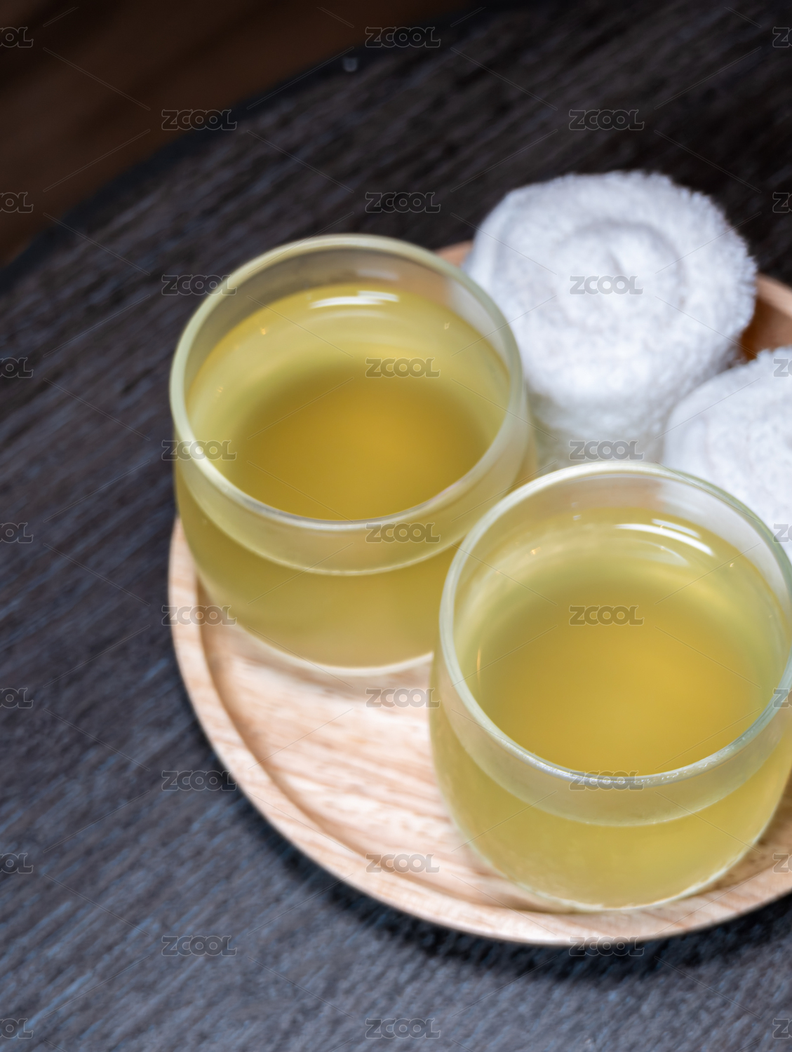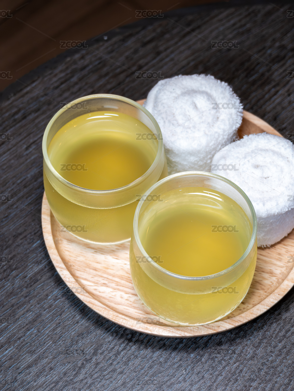 泰式水療中心木盤(pán)上的冰鎮(zhèn)草本茶和清涼毛巾