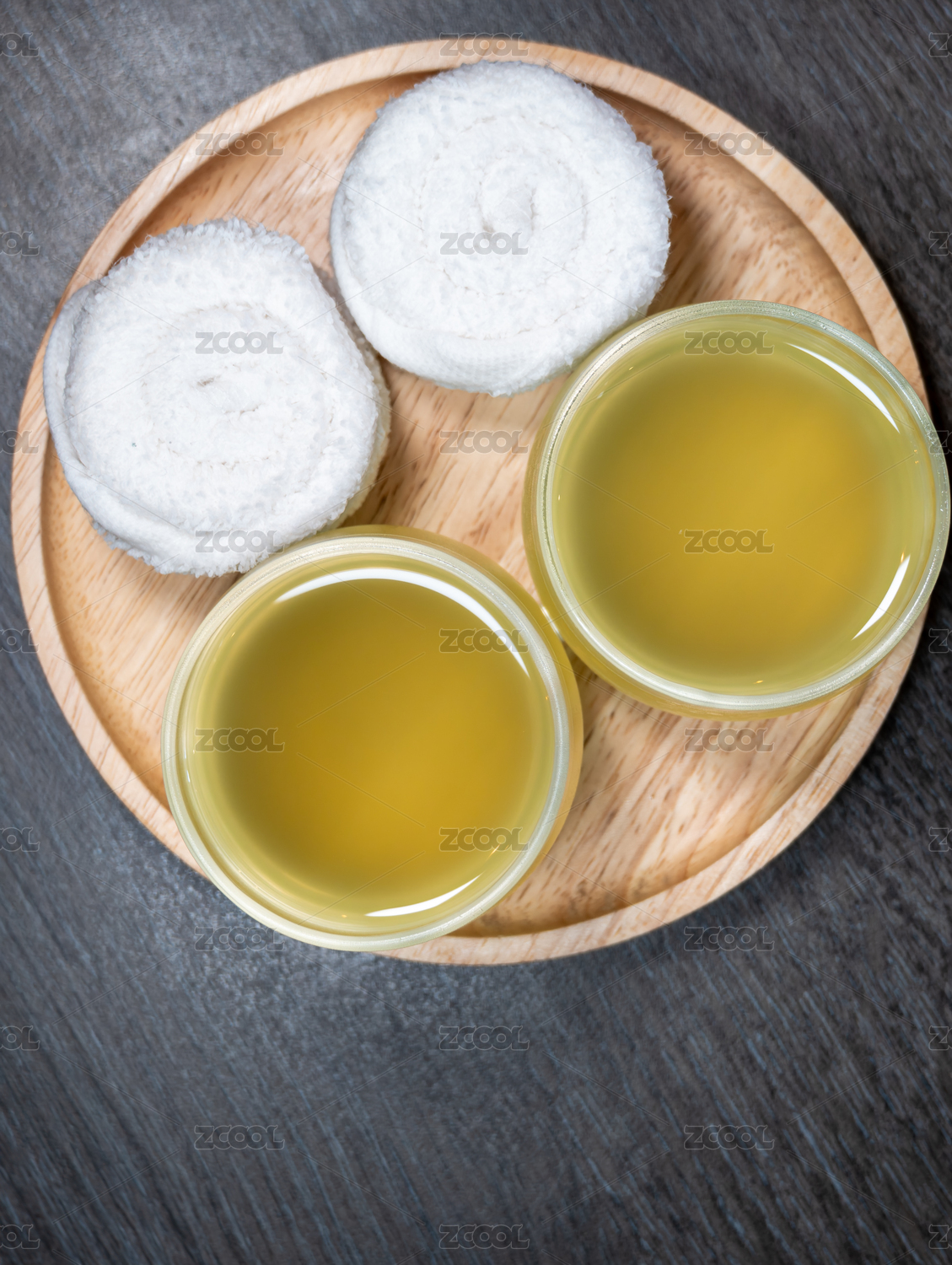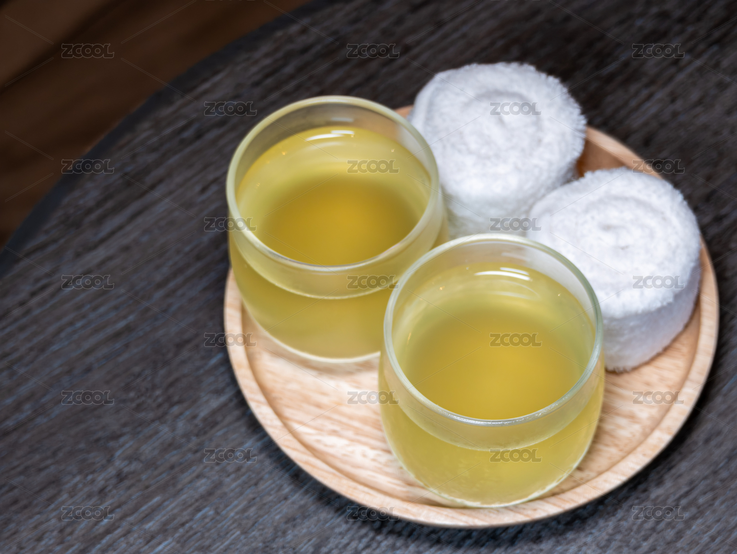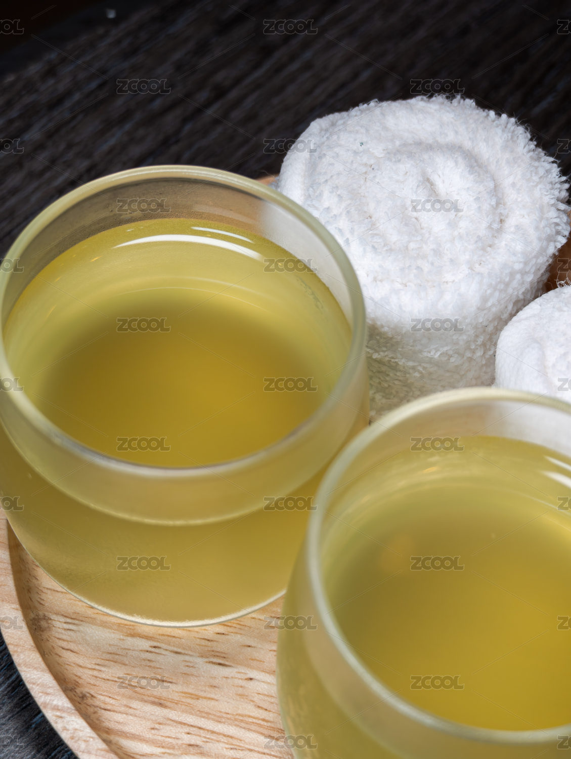 泰式水療中心木盤(pán)上的冰鎮(zhèn)草本茶和清涼毛巾