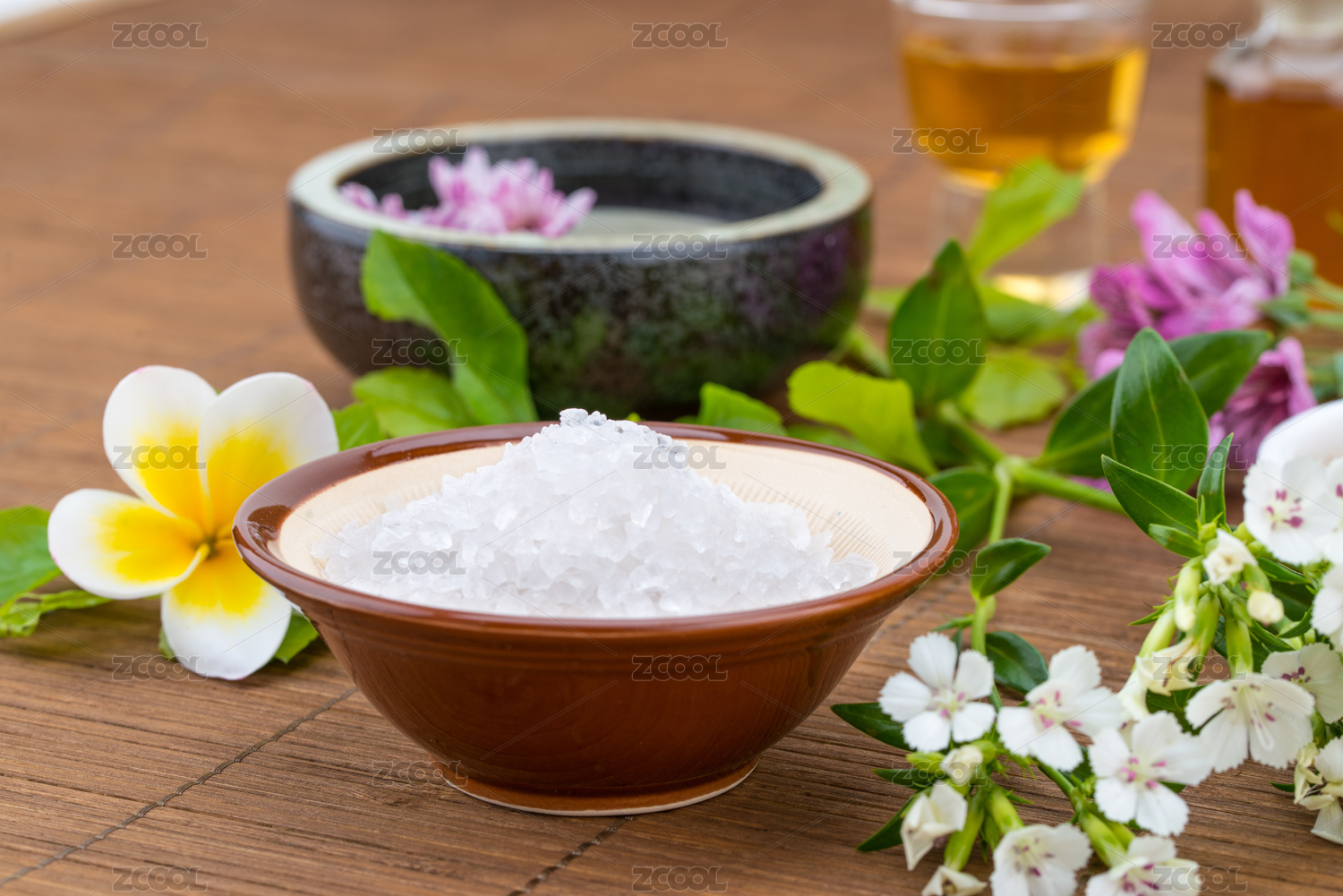 鹽碗,精油,花浮在水面上中國(guó)背景的健康水療