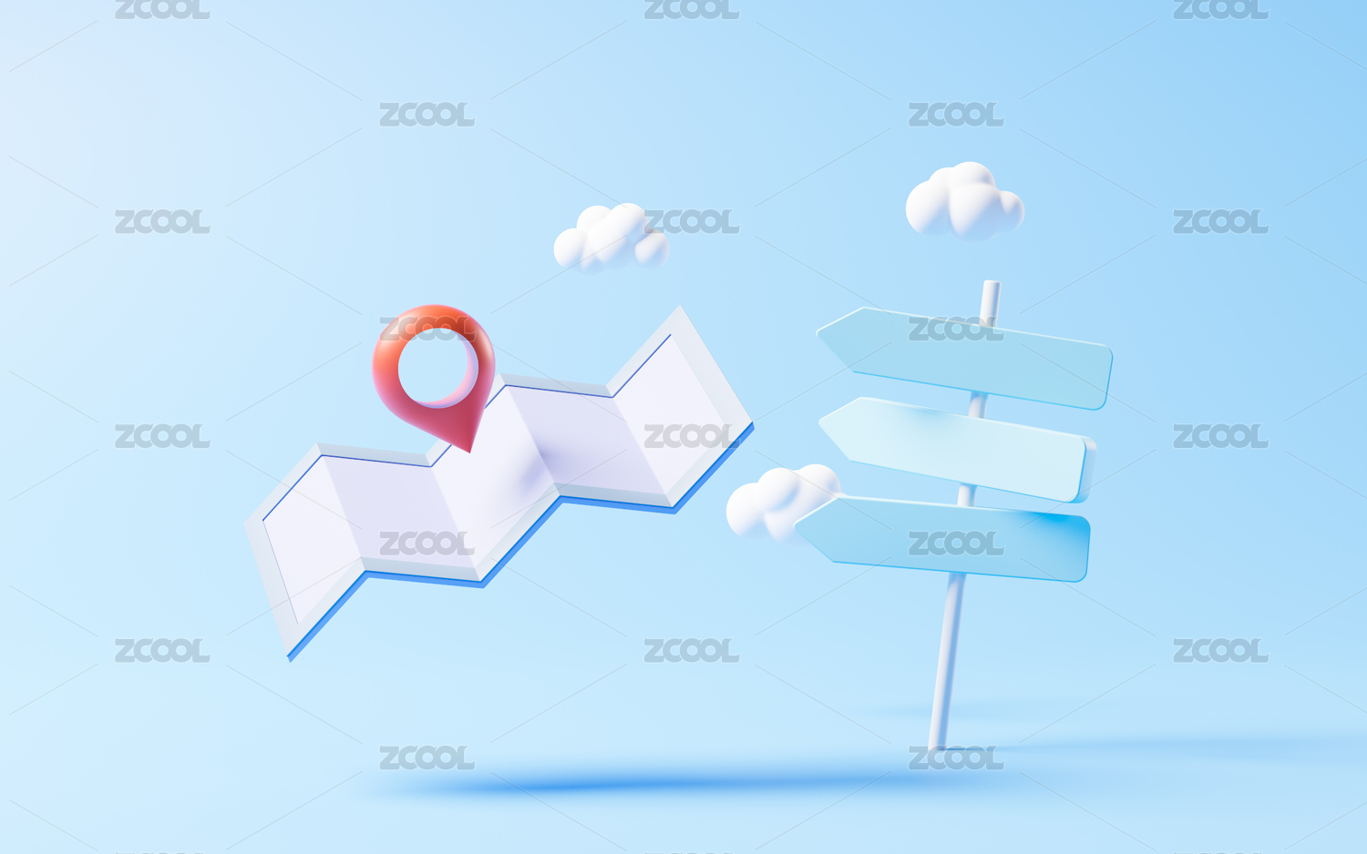 三維渲染的旅游主題的路標(biāo)和遮陽帽