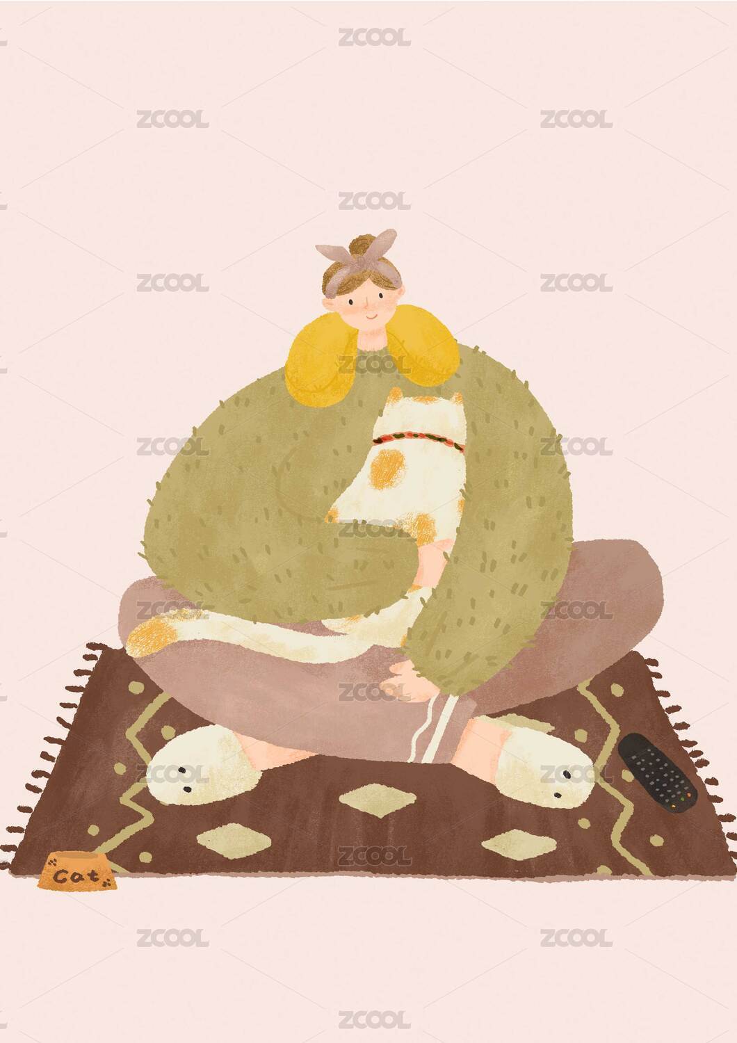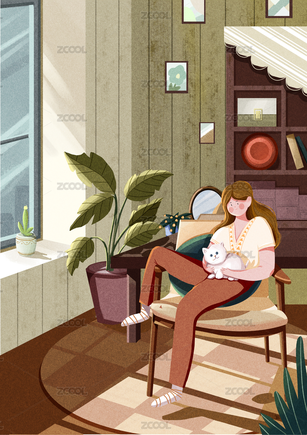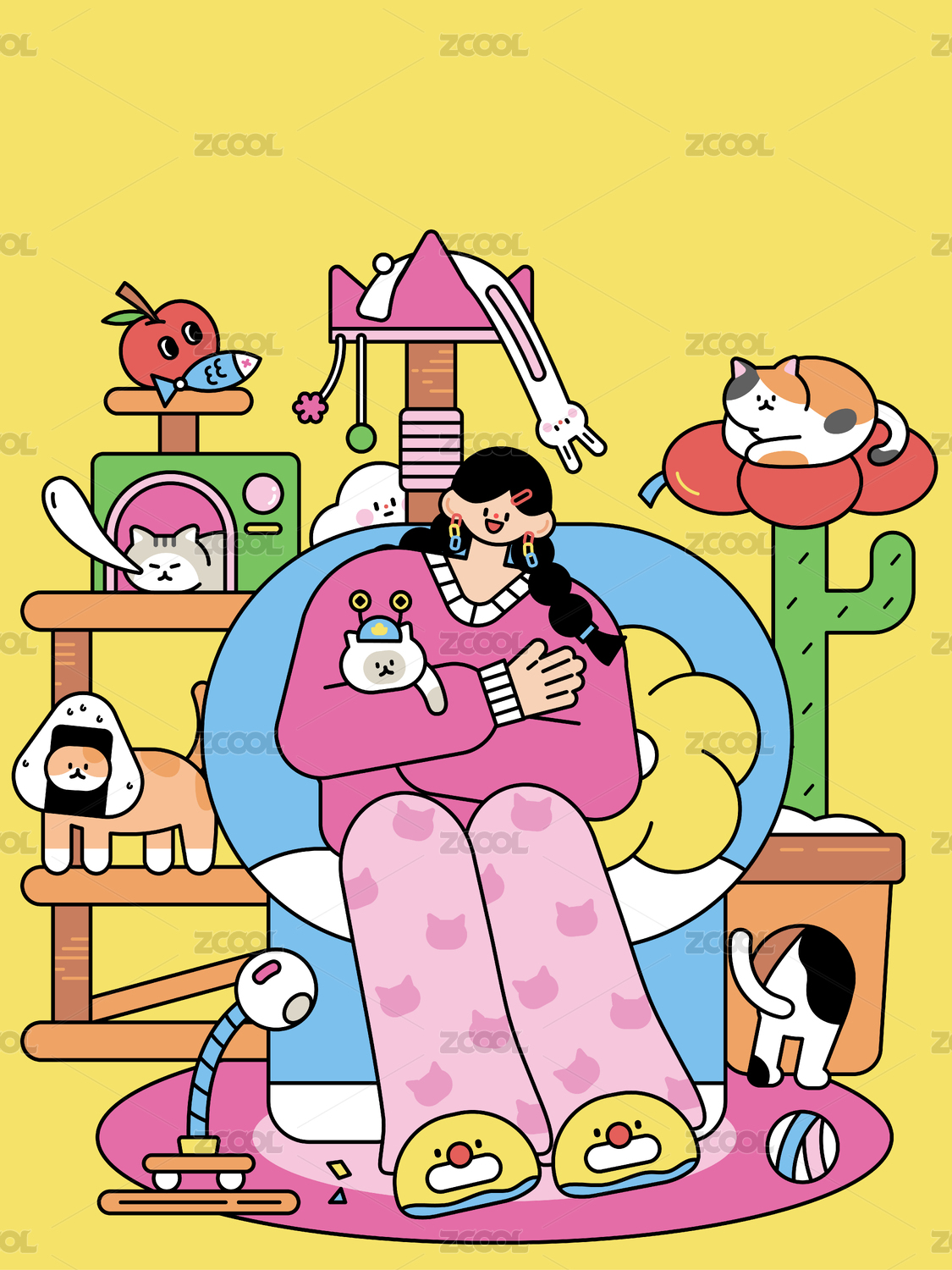 養(yǎng)貓人在家里擼貓放松的幸福時(shí)刻,噪點(diǎn)插畫(huà)