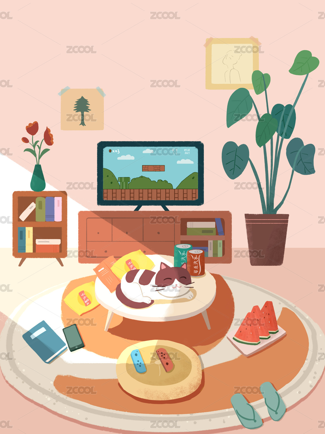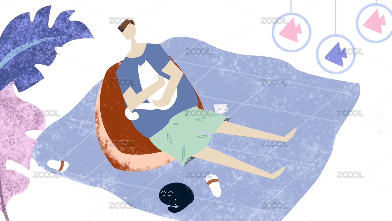 創(chuàng)意插畫(huà)原創(chuàng)插畫(huà)擼貓單身生活日常休閑夏天綠植藍(lán)色手繪插畫(huà)