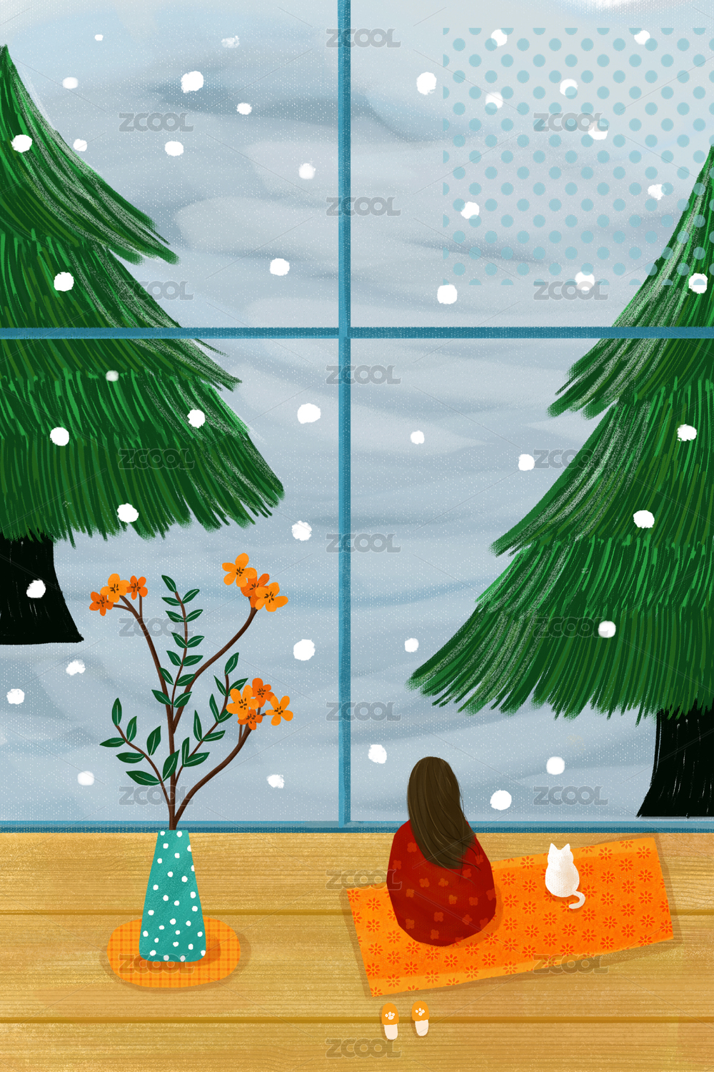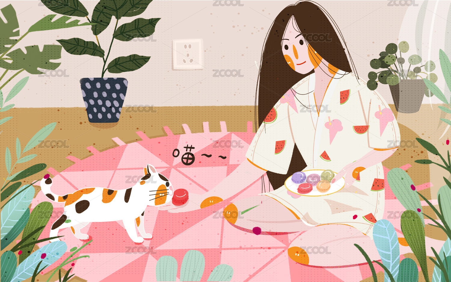 小清新居家生活擼貓喂貓吃馬卡龍的女孩插畫(huà)