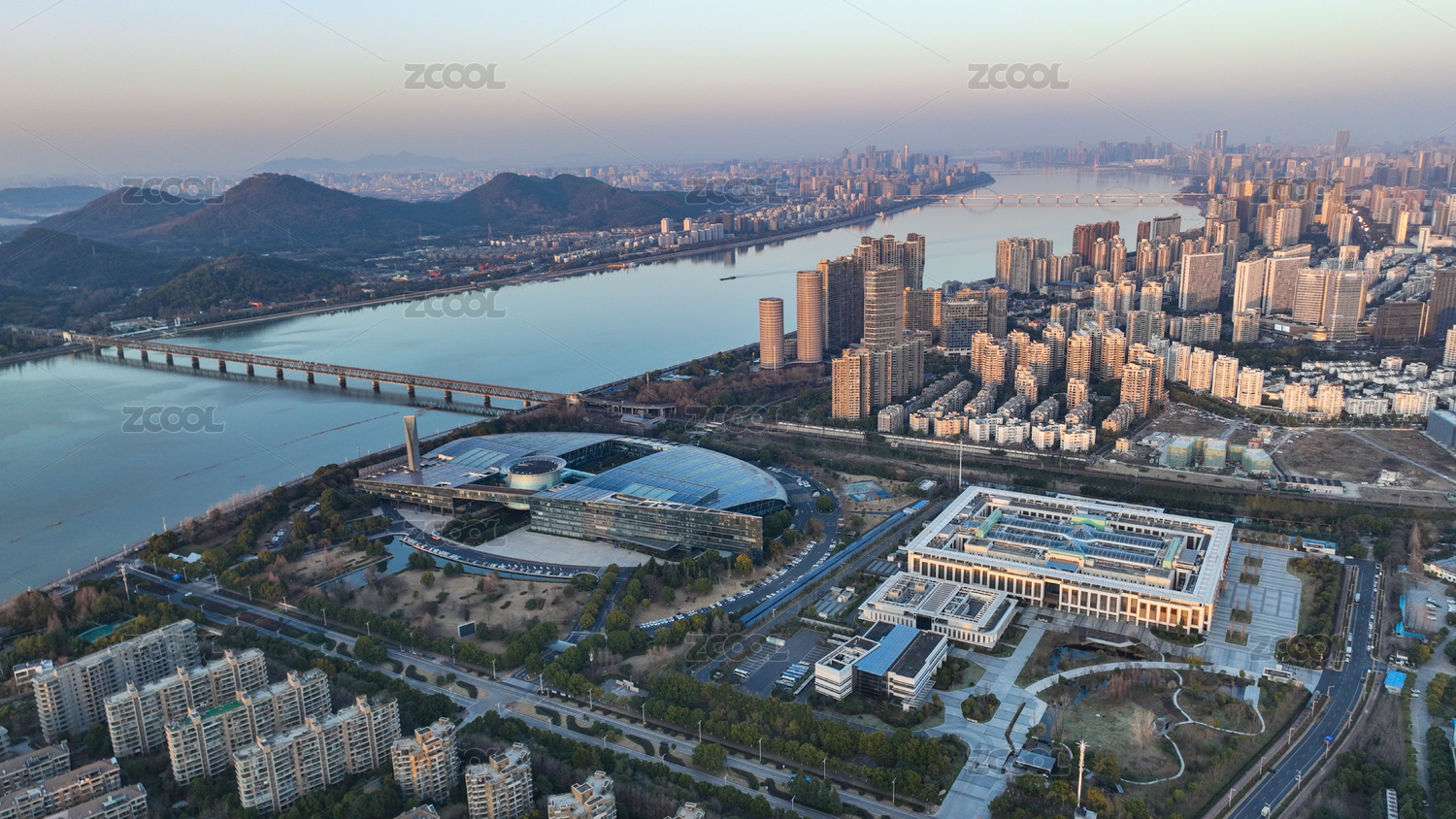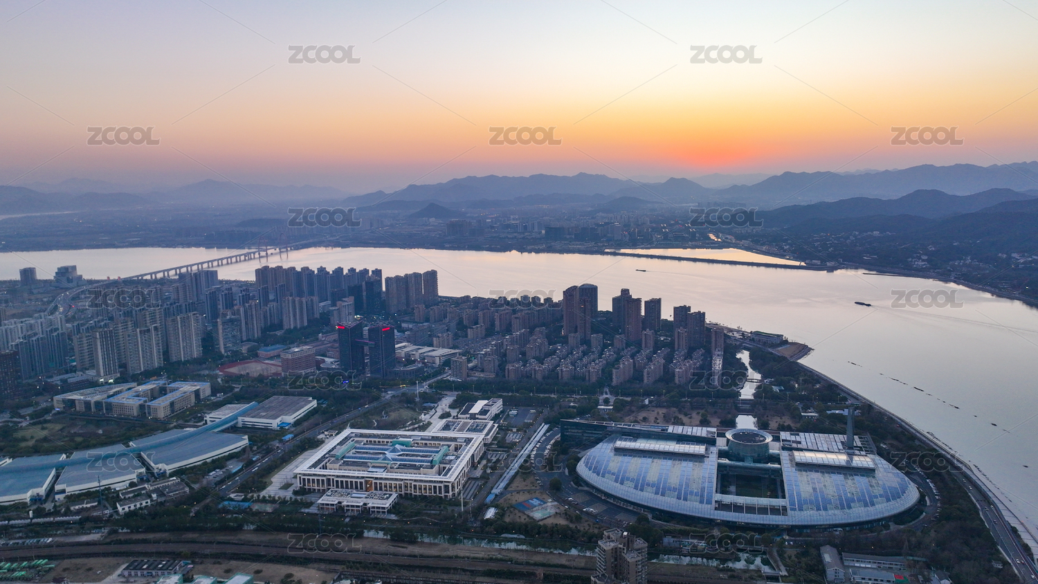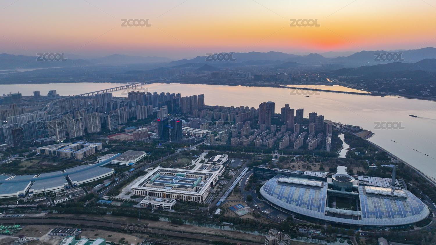 中國浙江省杭州市濱江區(qū)錢塘江邊海創(chuàng)園日落