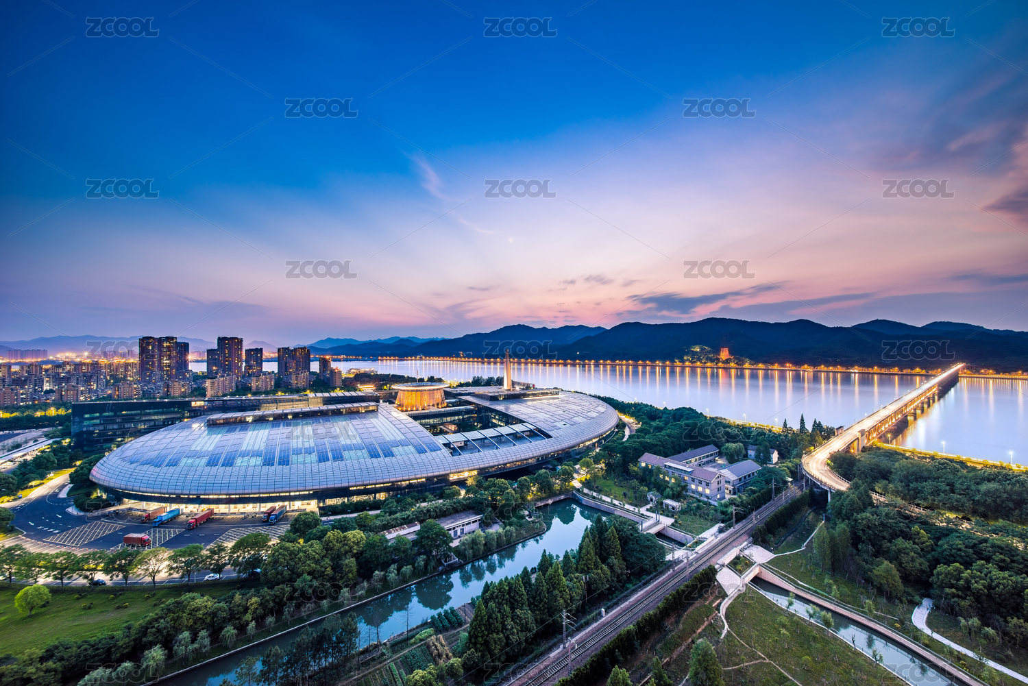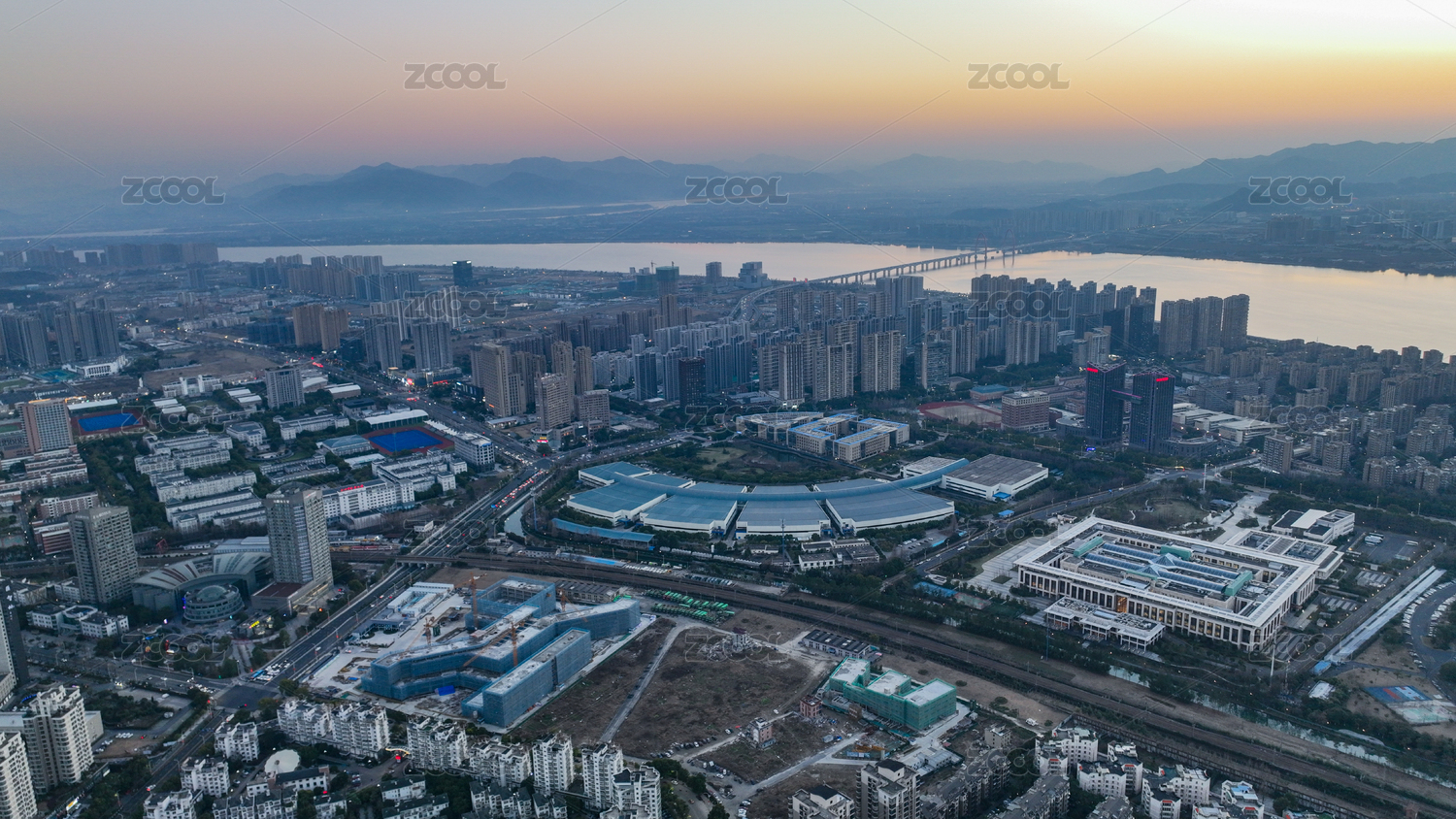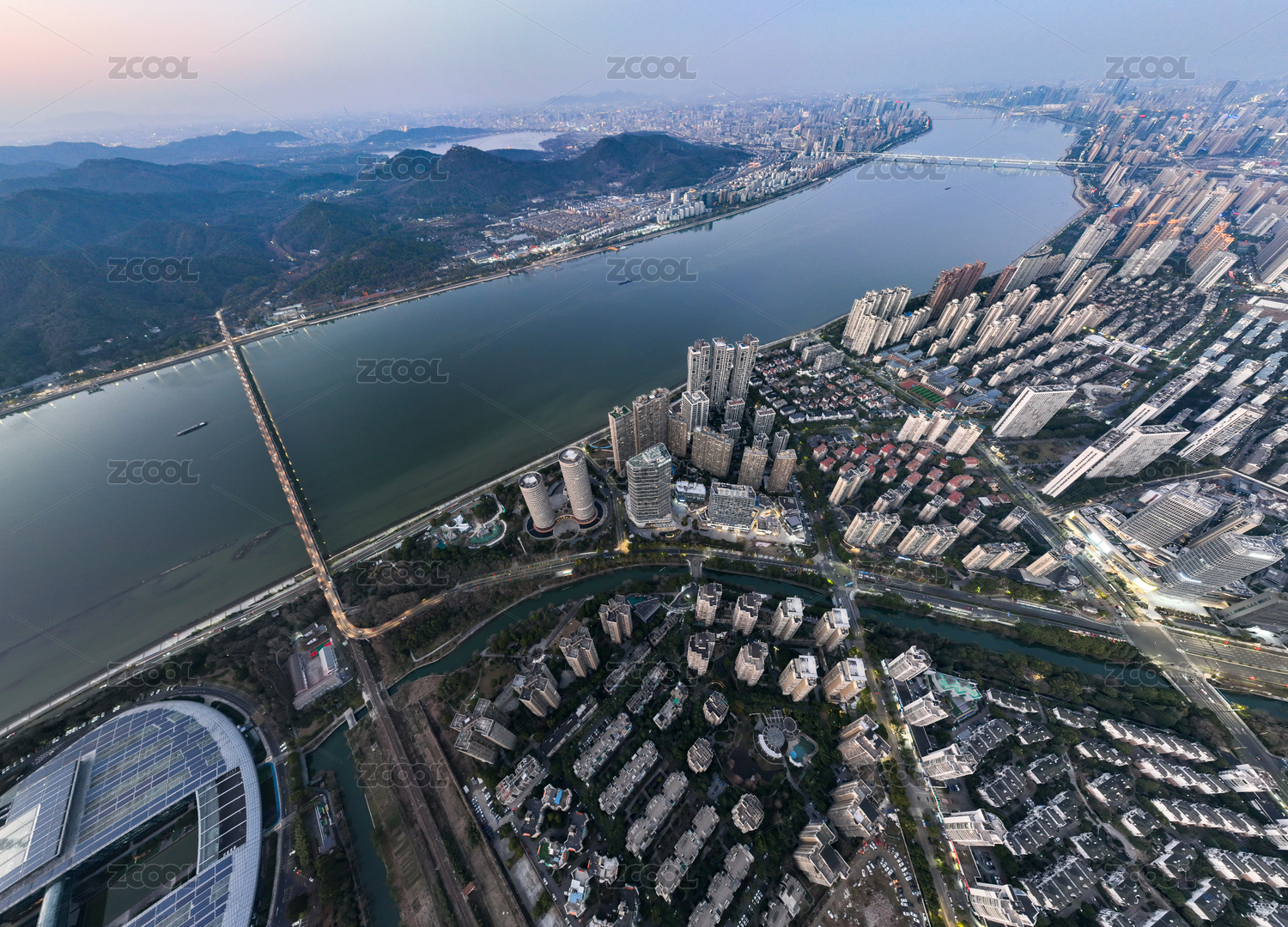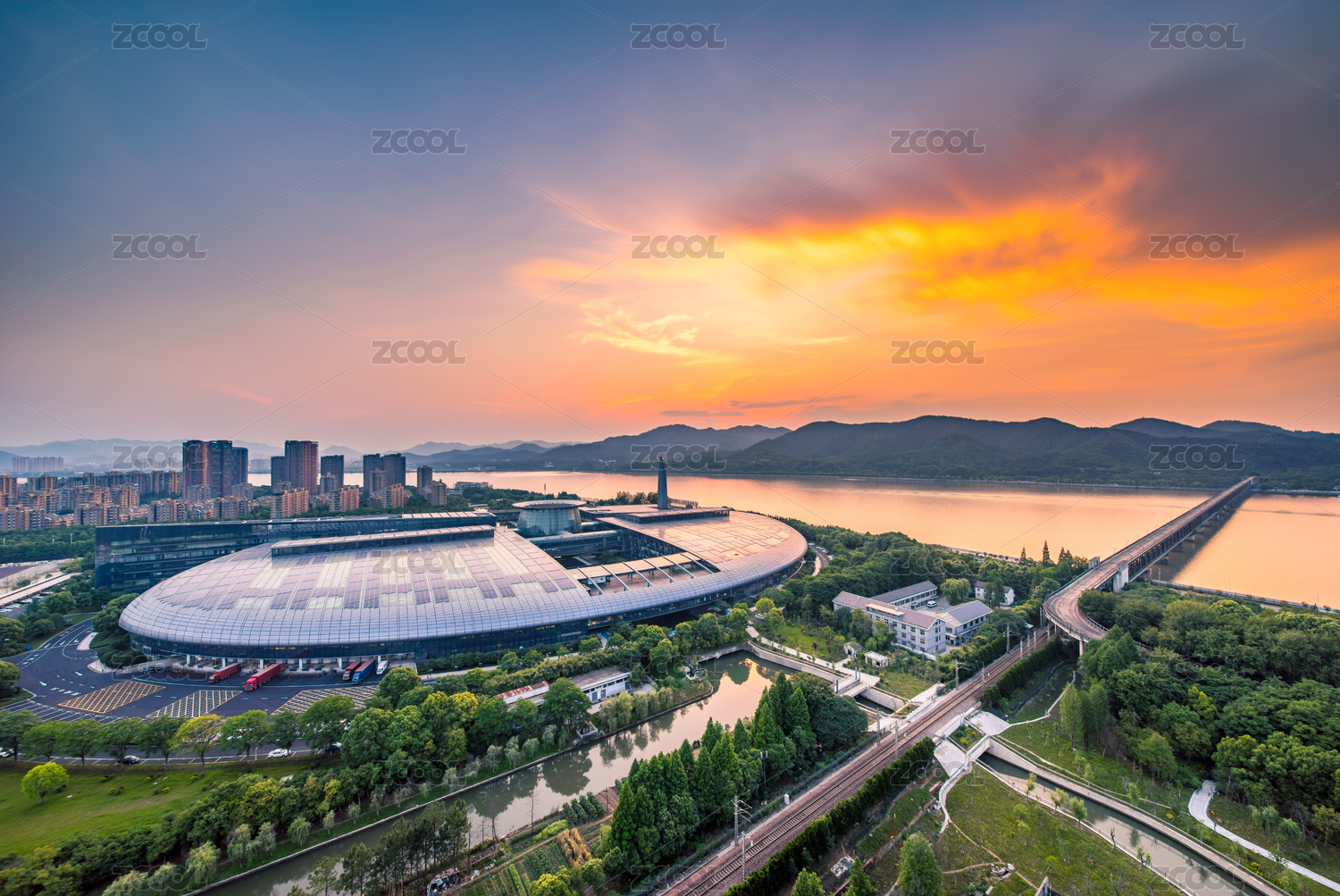 中國浙江省杭州市濱江區(qū)錢塘江邊海創(chuàng)園日落