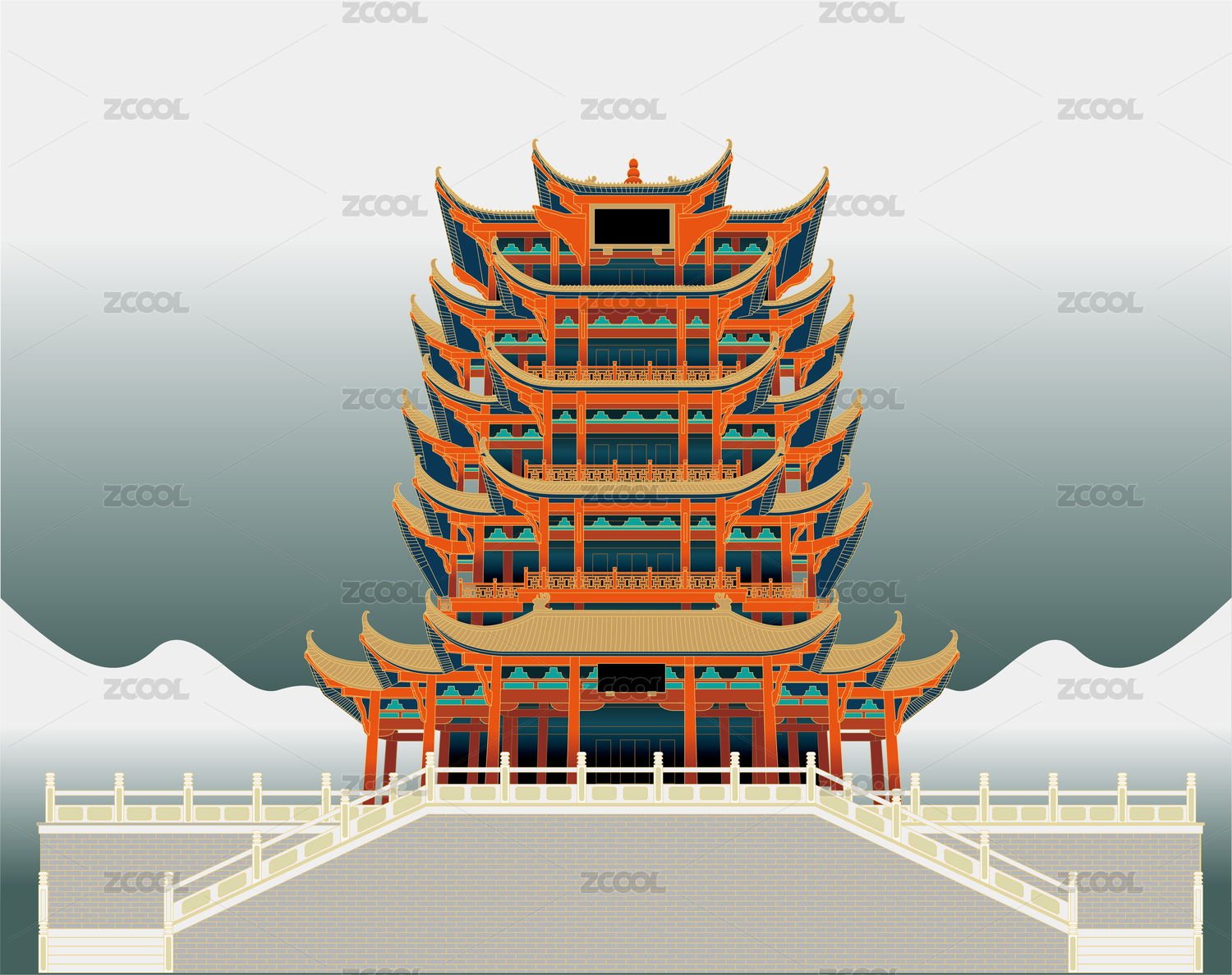 江南名樓黃鶴樓古風(fēng)建筑手繪矢量圖