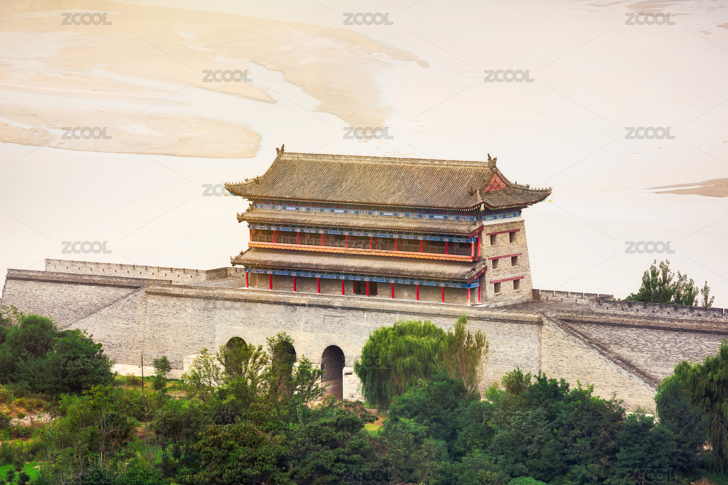中國(guó)陜西黃河邊的潼關(guān)城樓古建筑遠(yuǎn)景圖