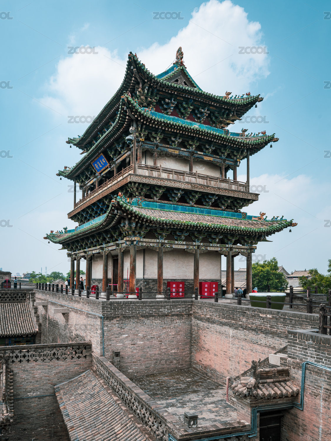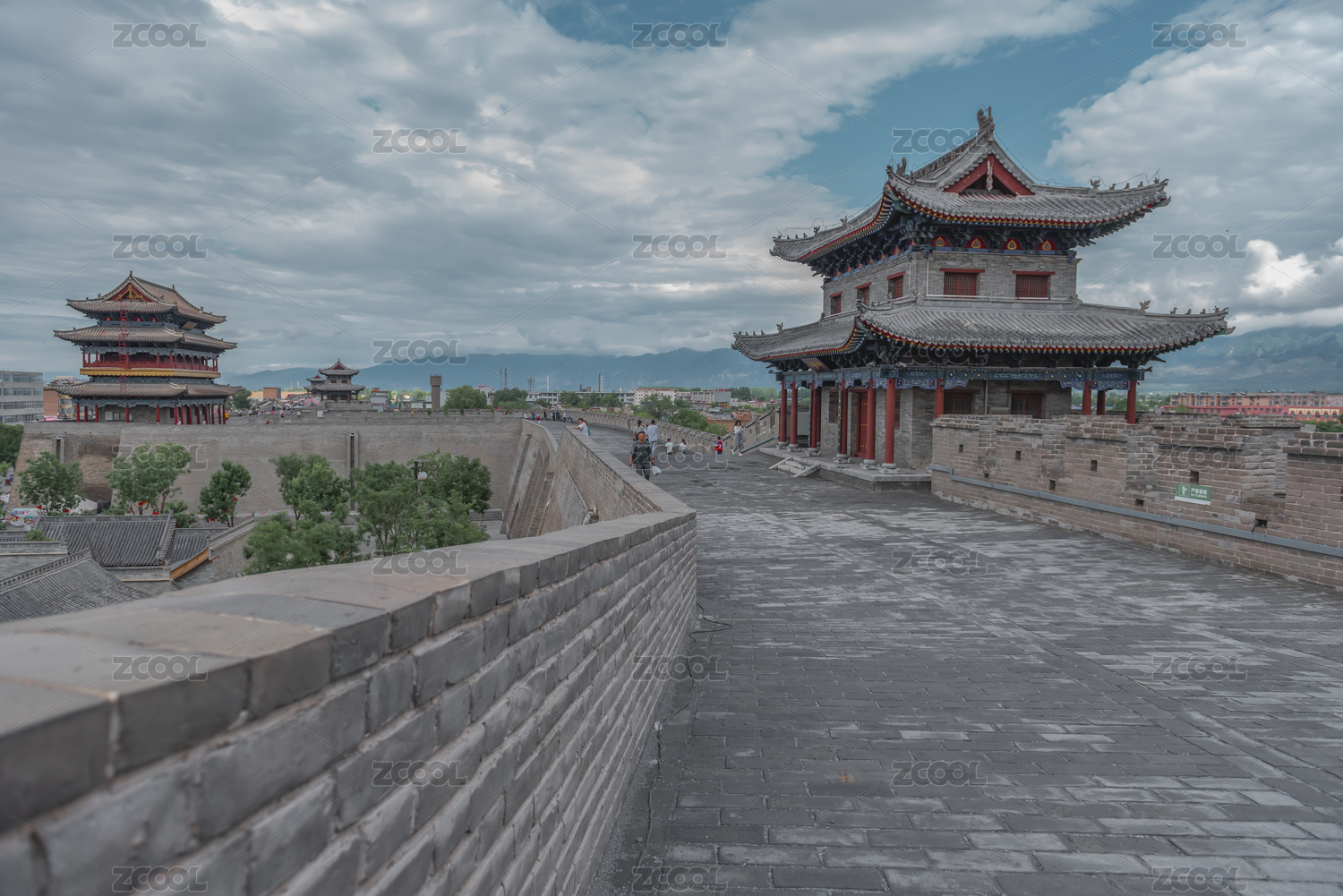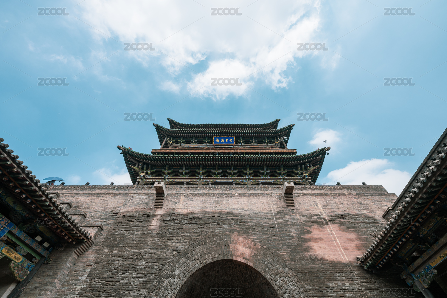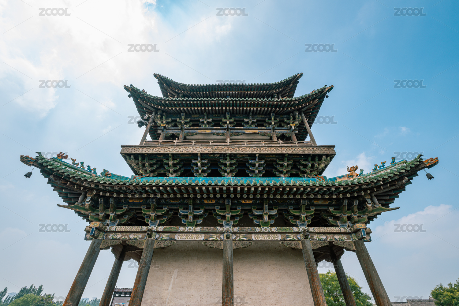 中國(guó)山西大同藍(lán)天白云下綠樹(shù)環(huán)繞古城墻城樓