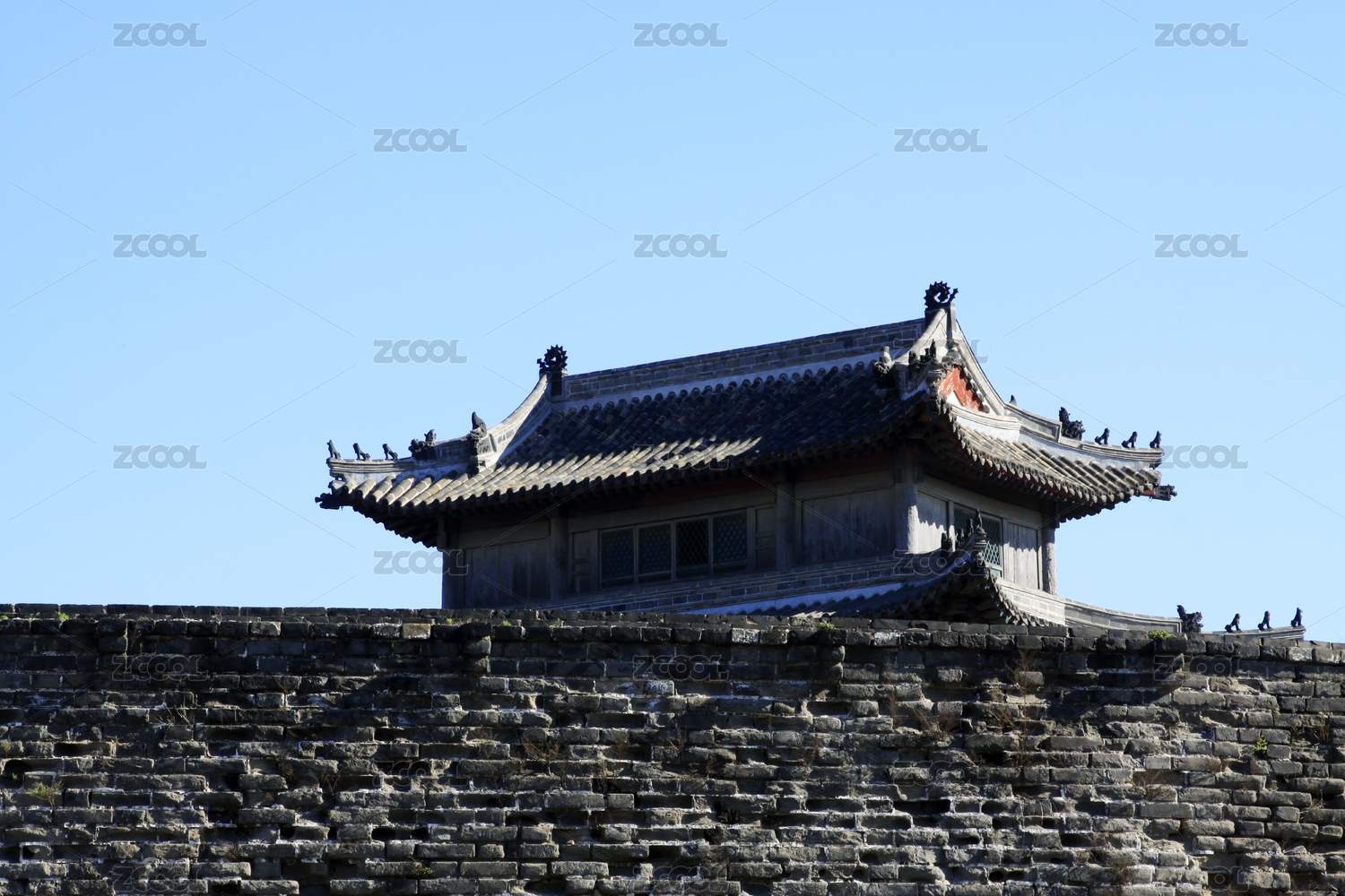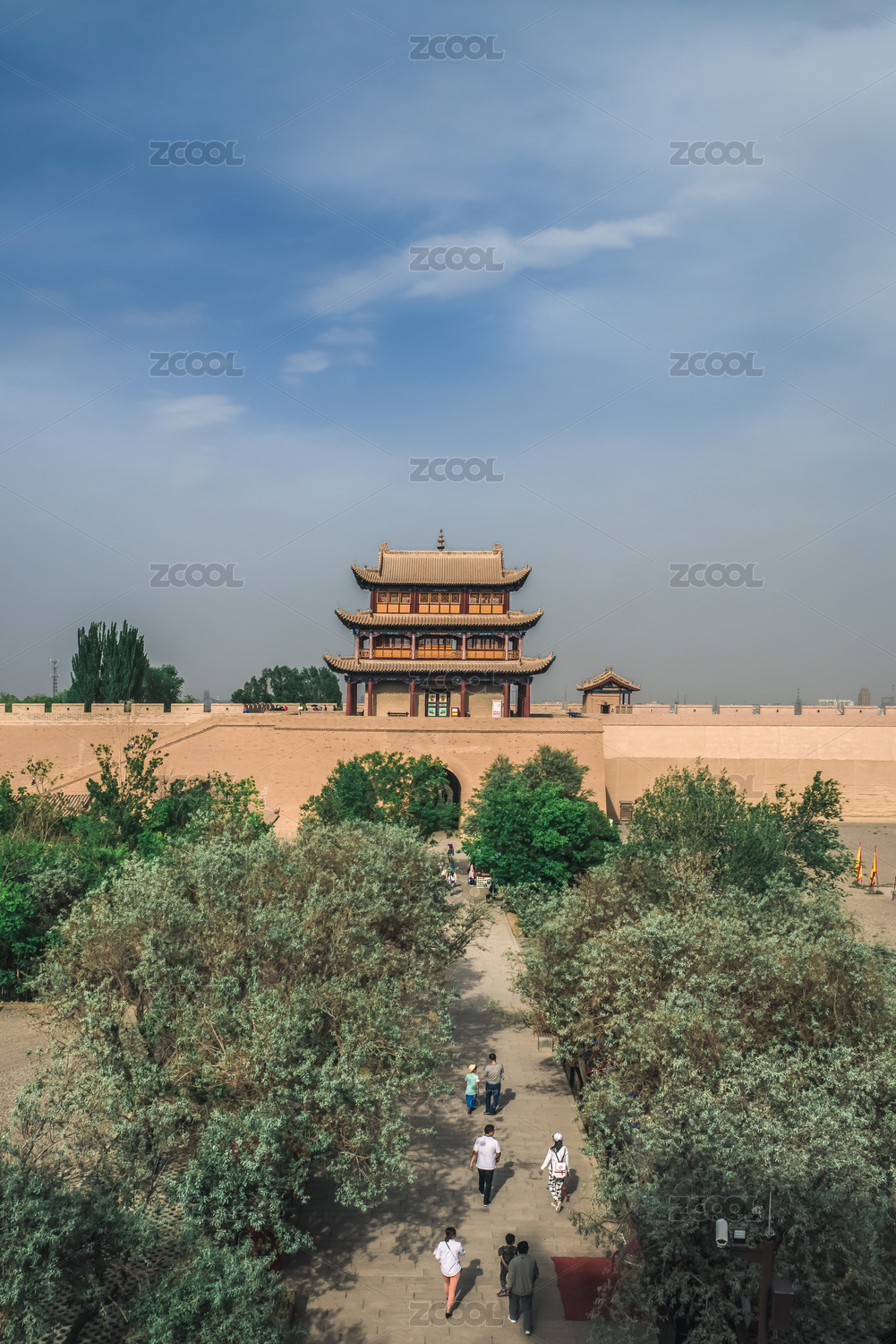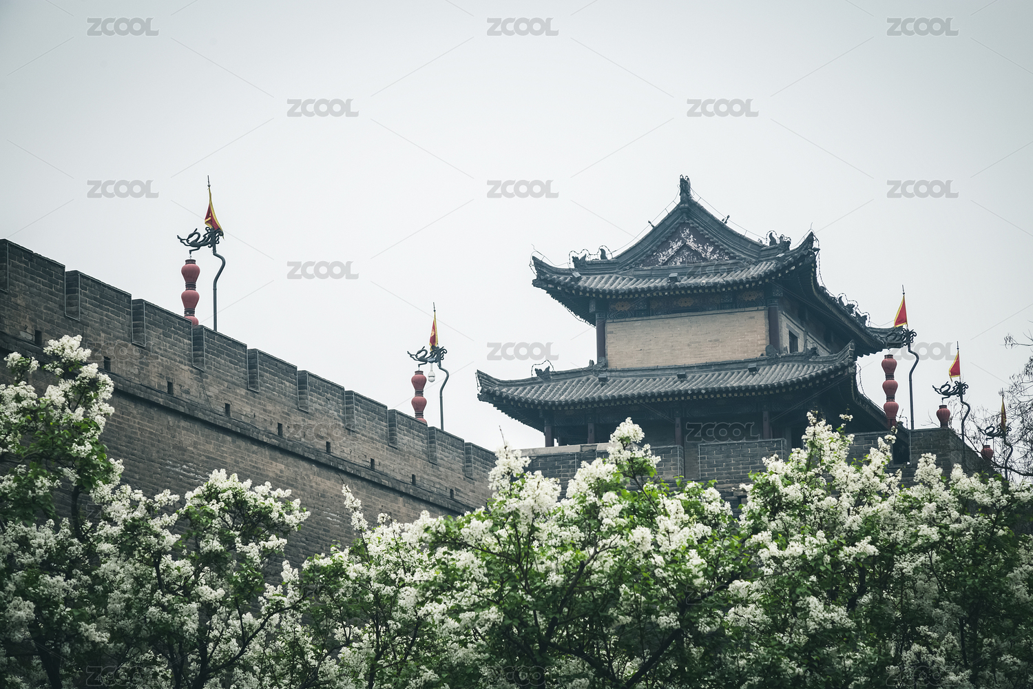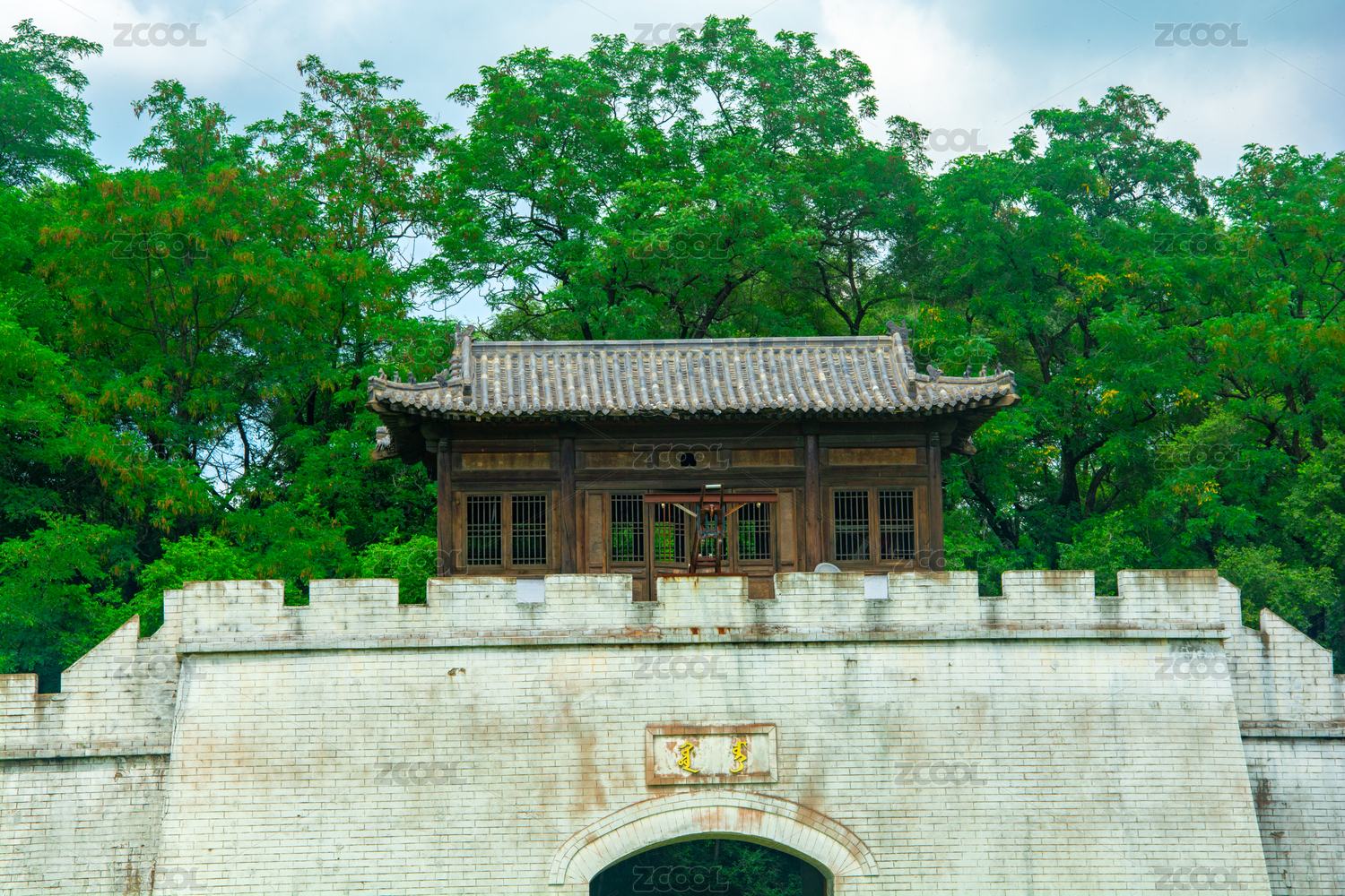中國(guó)山西大同藍(lán)天白云下綠樹(shù)環(huán)繞古城墻城樓
