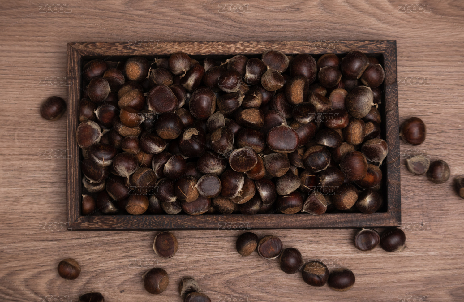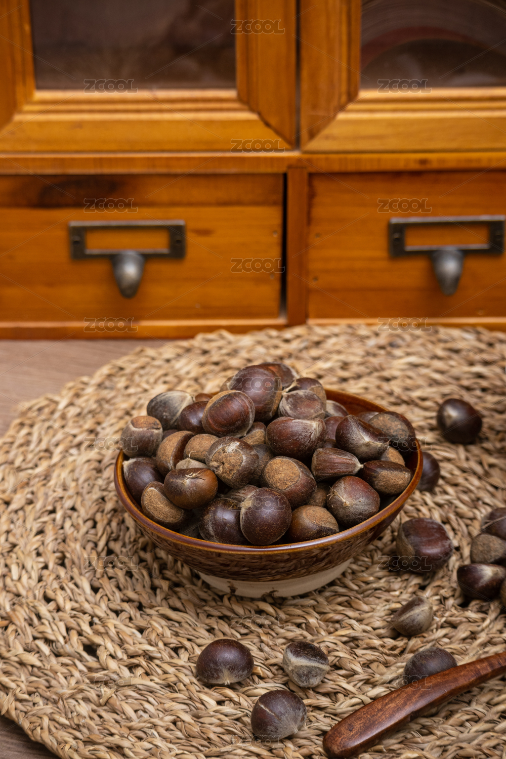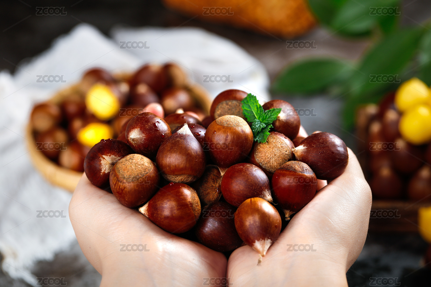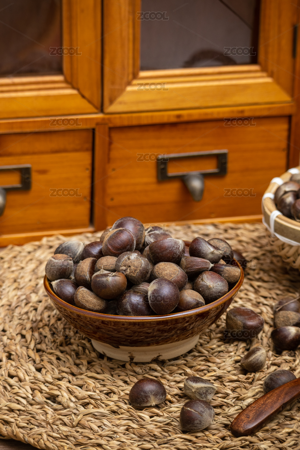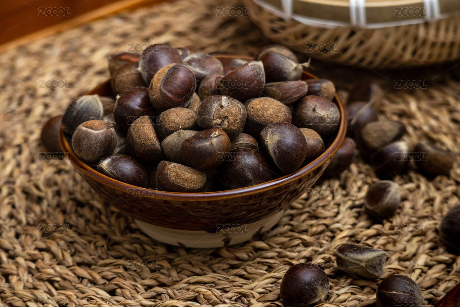 桌面碗里裝滿新鮮采摘下來的野生栗子板栗