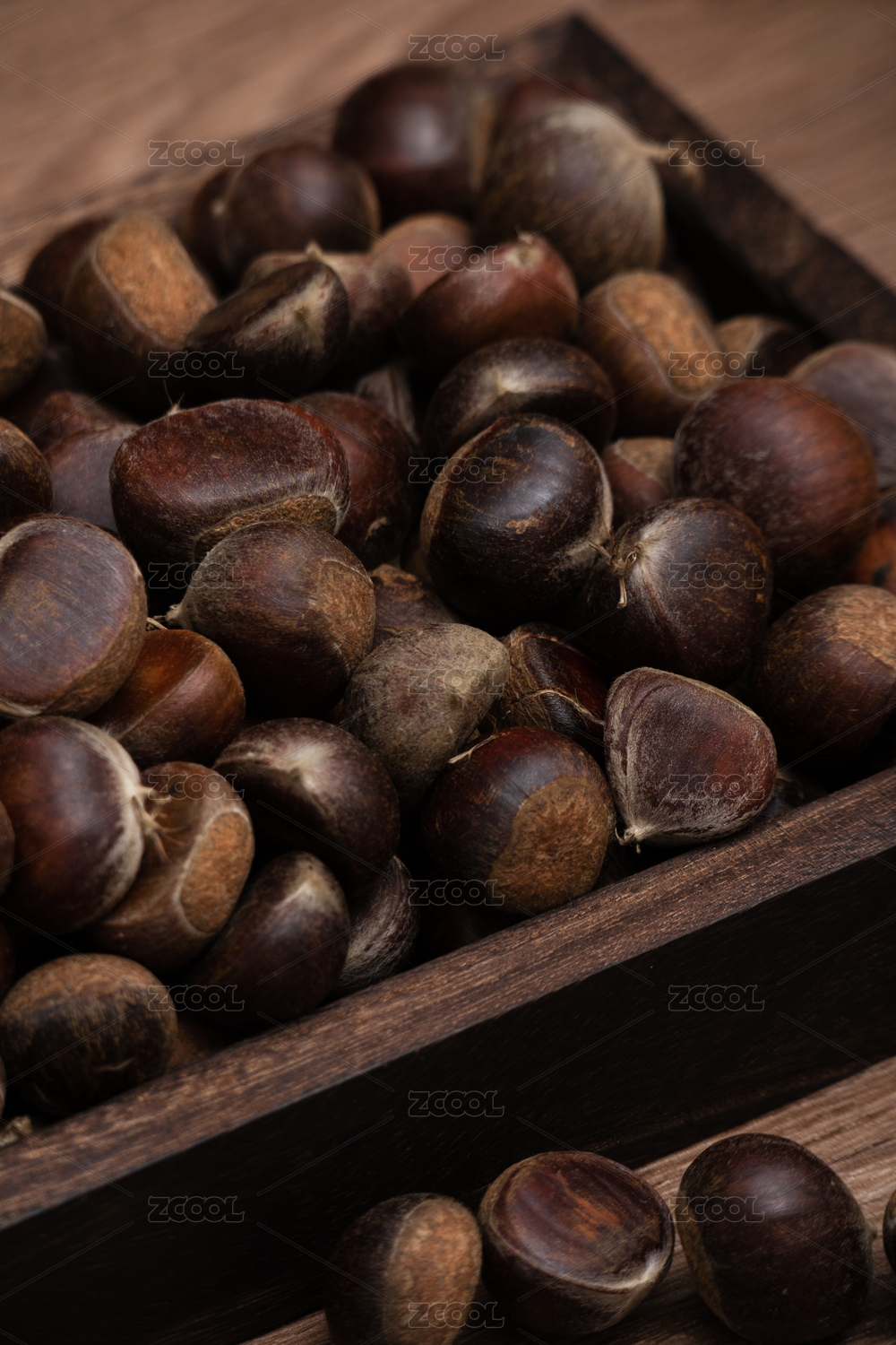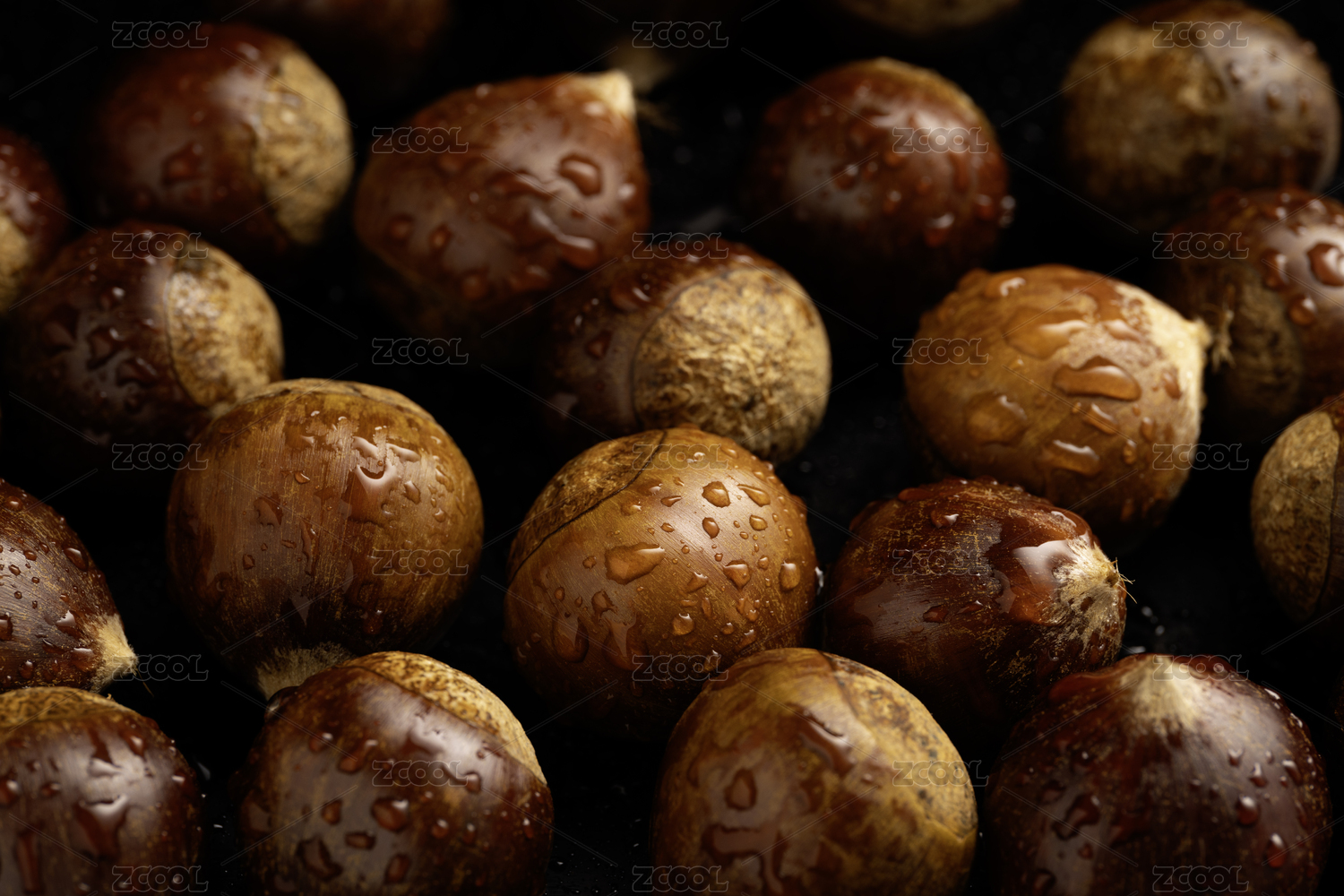 黑色背景桌面上擺滿新鮮采摘下的野生栗子