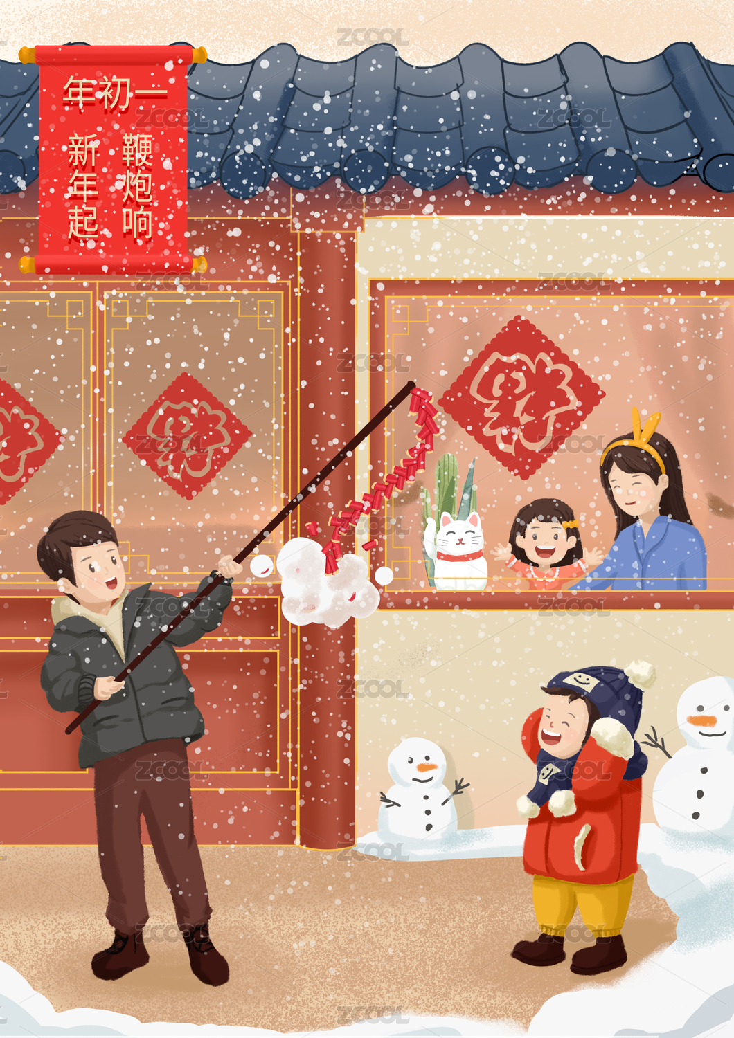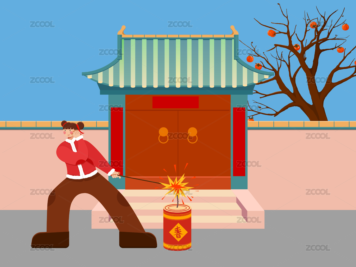 中國(guó)傳統(tǒng)年俗大年初一放鞭炮插畫(huà)