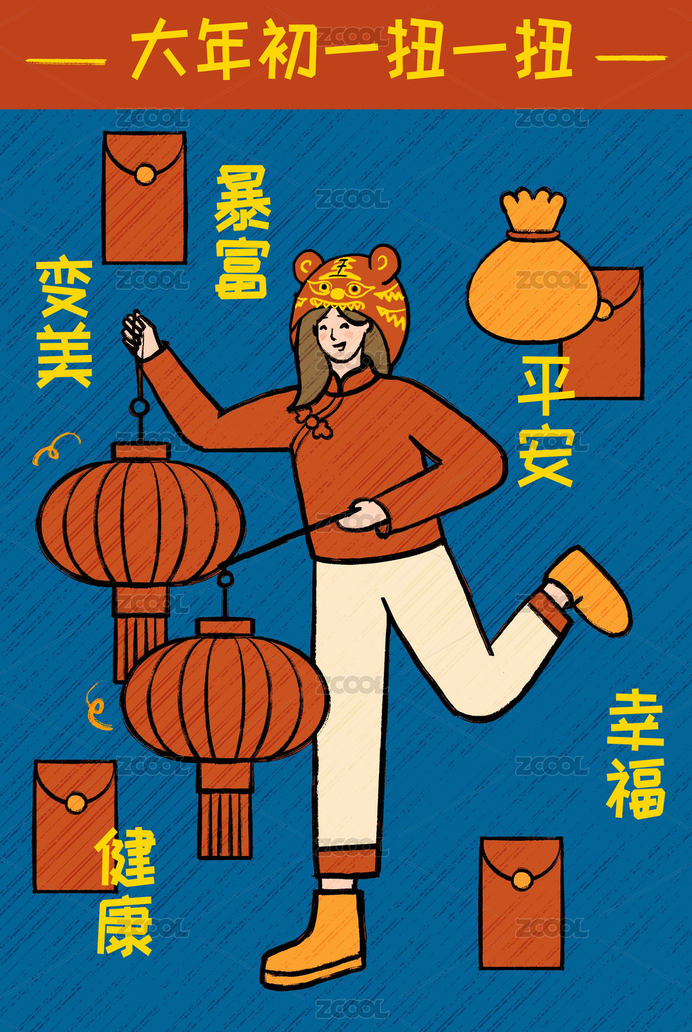 春節(jié)民俗年畫(huà)風(fēng)格-大年初一街上走