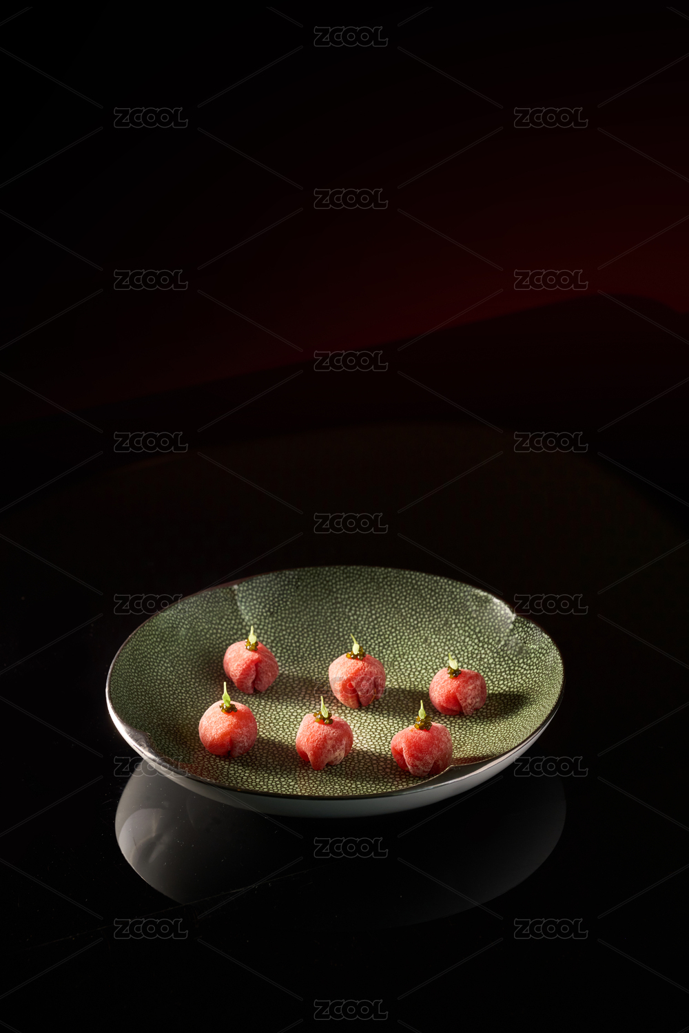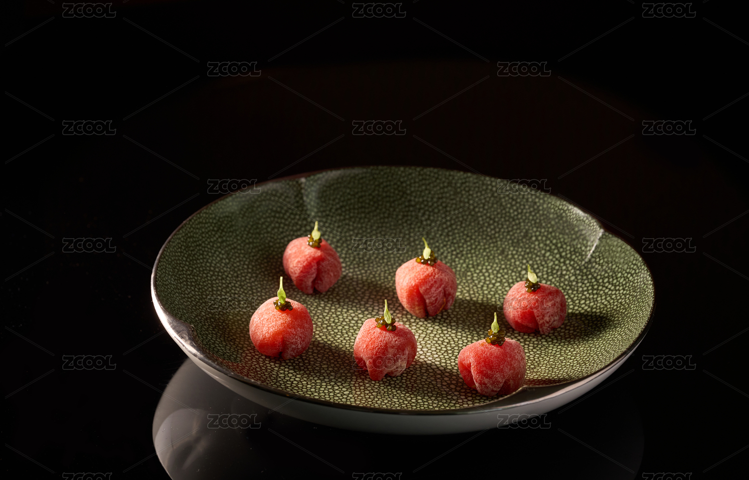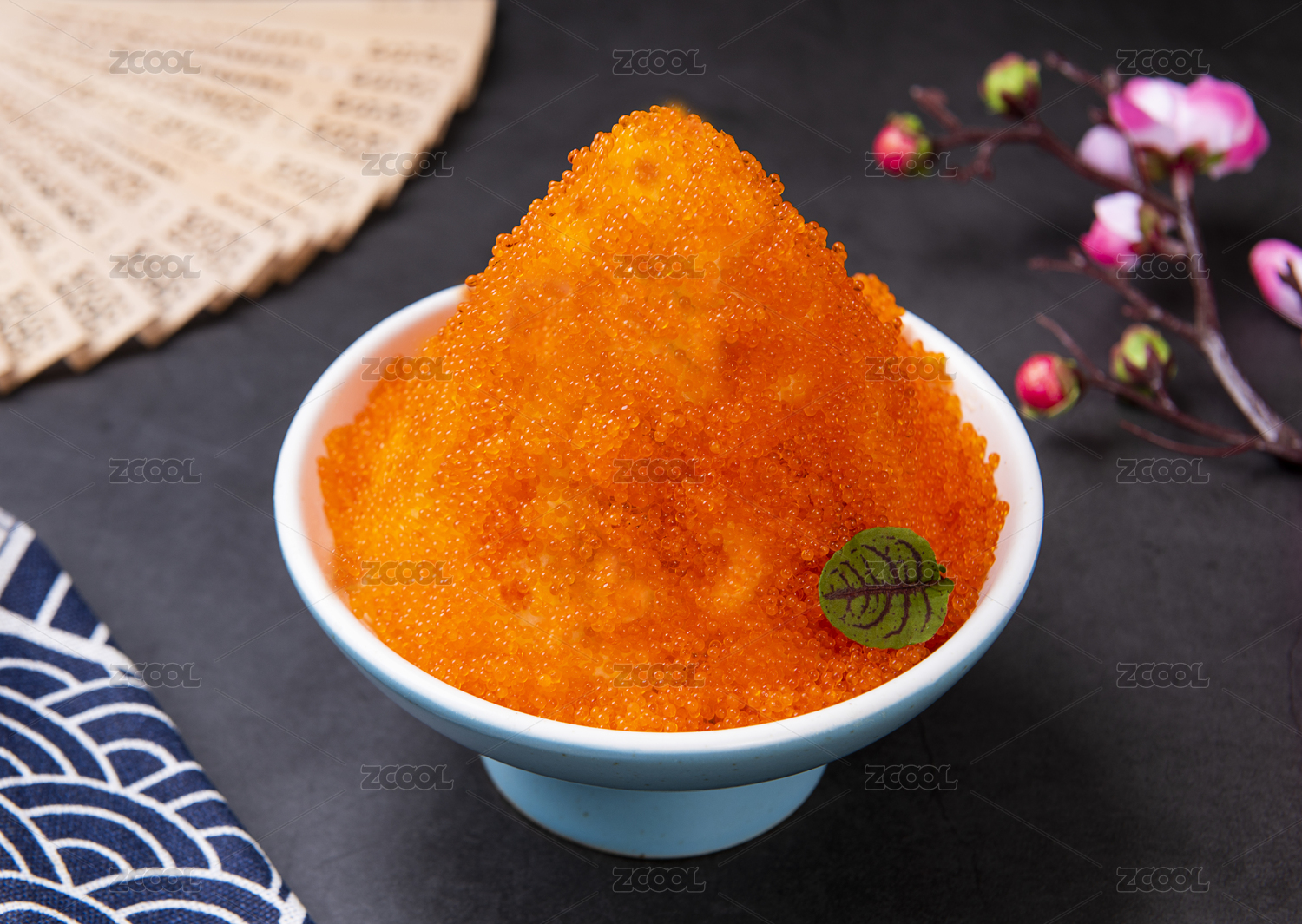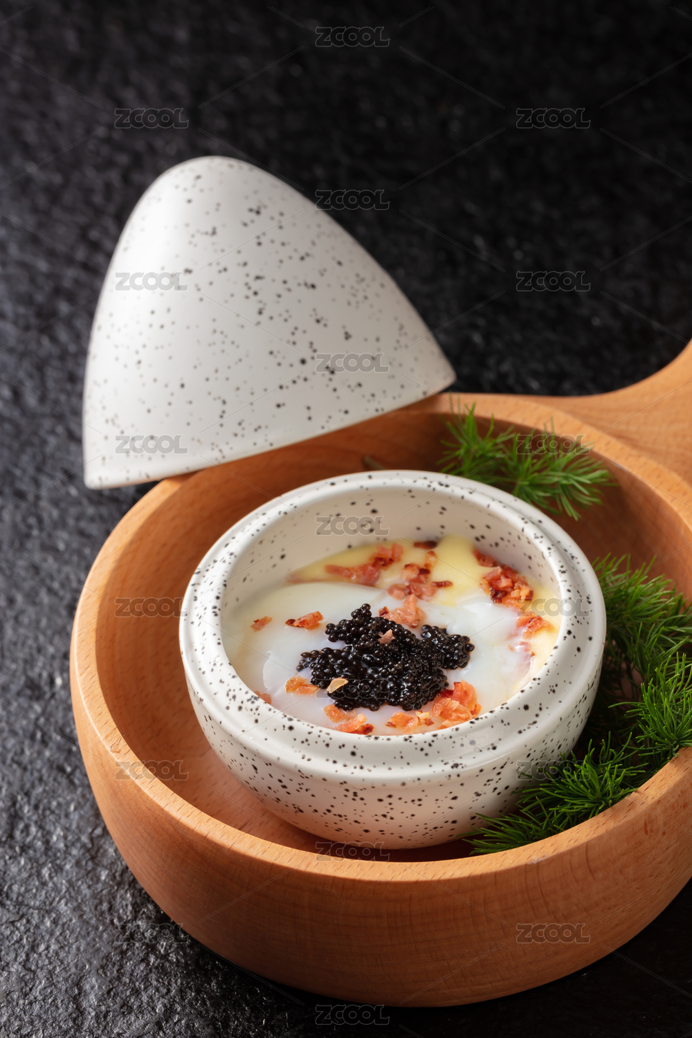 雞蛋形碗里的魚(yú)籽醬火腿粒雪蛤芙蓉蛋