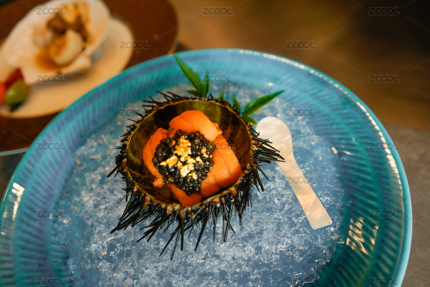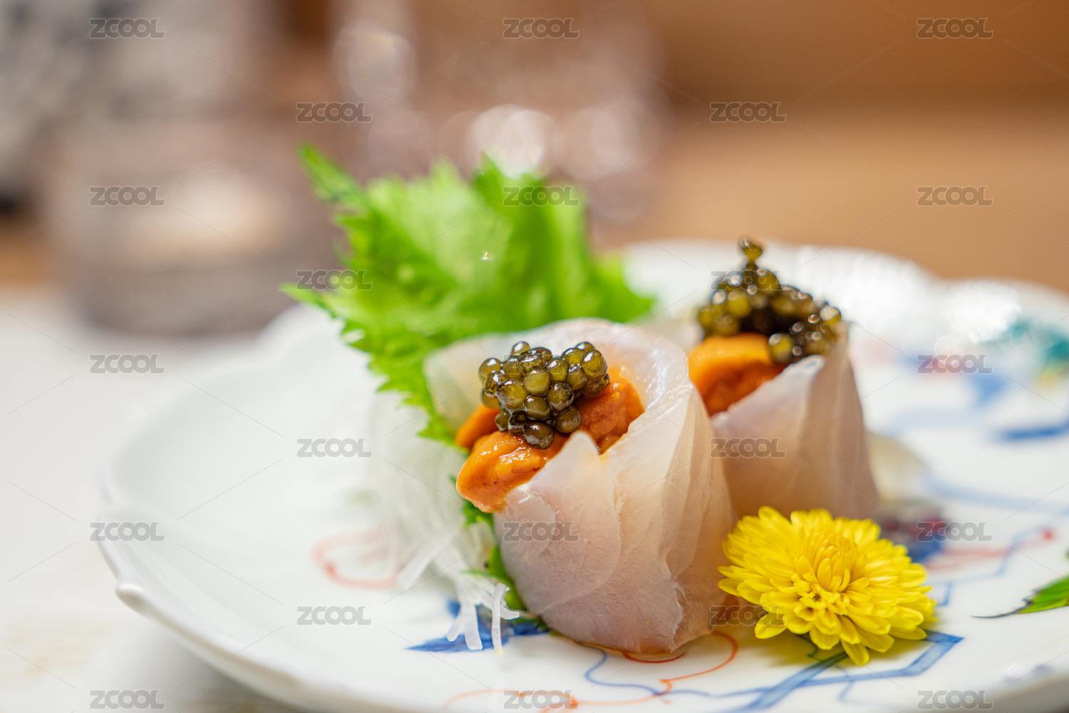 海膽?hù)~(yú)籽醬鯛魚(yú)刺身擺盤(pán)放木桌子上