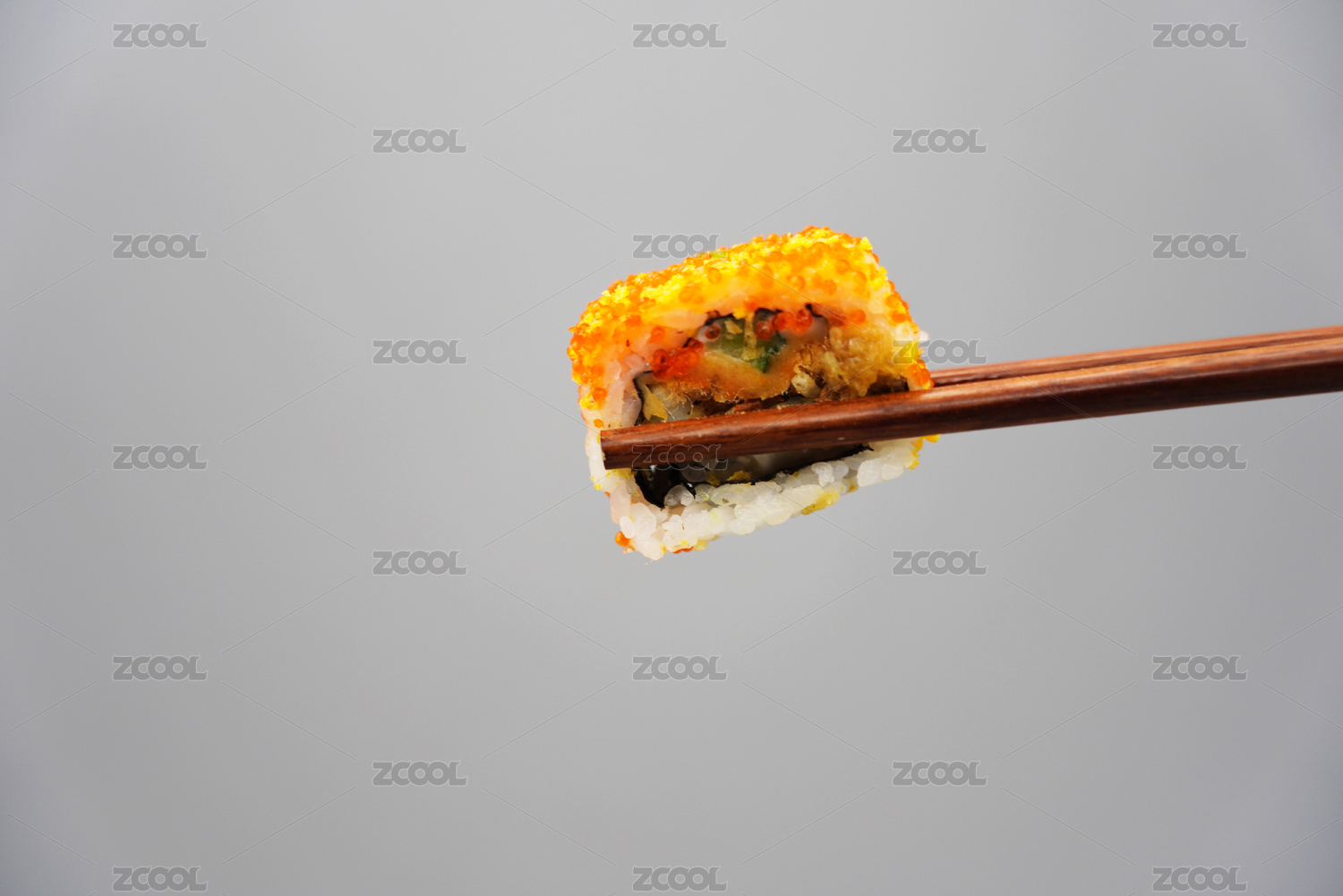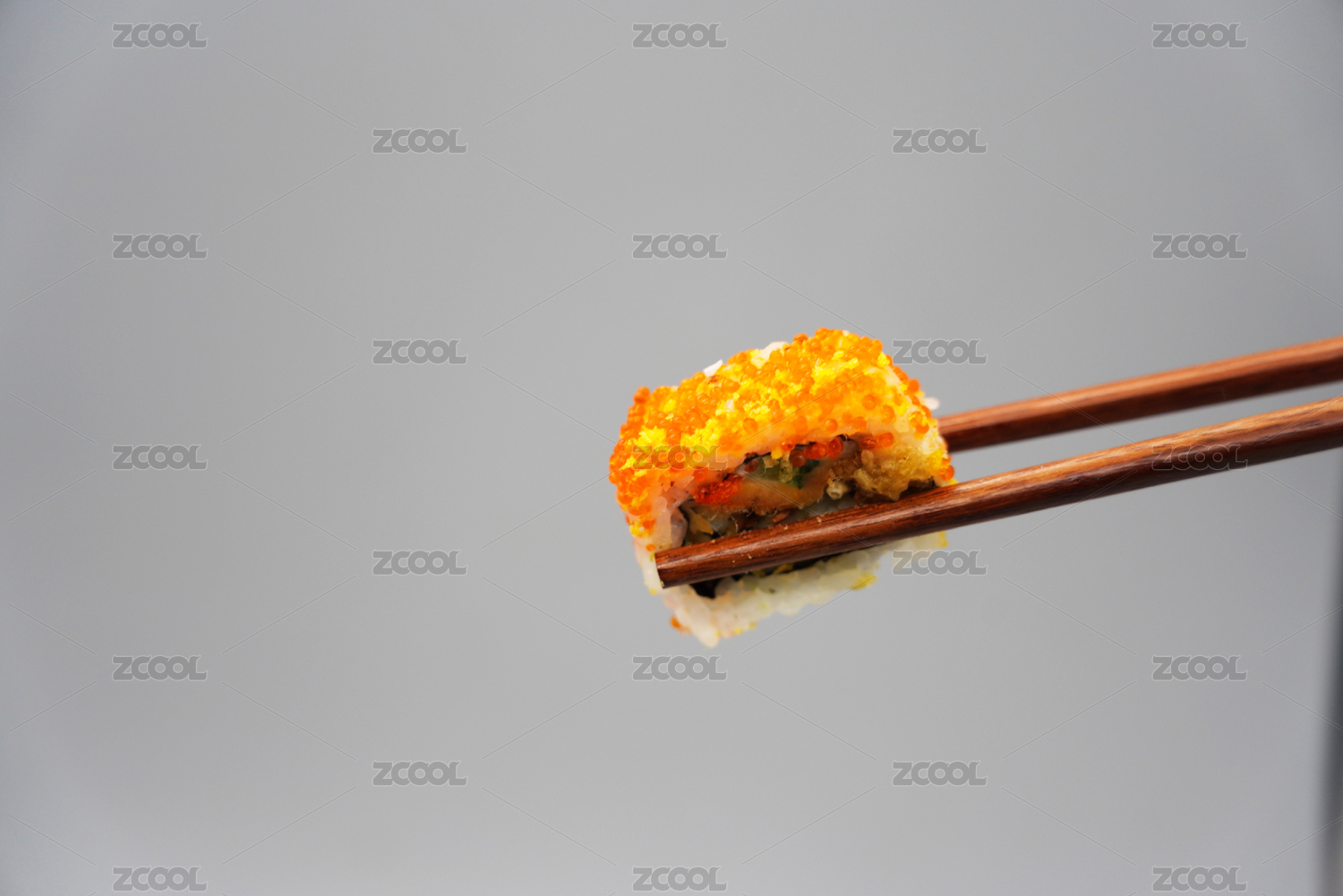 筷子夾起的日本料理魚(yú)籽醬壽司