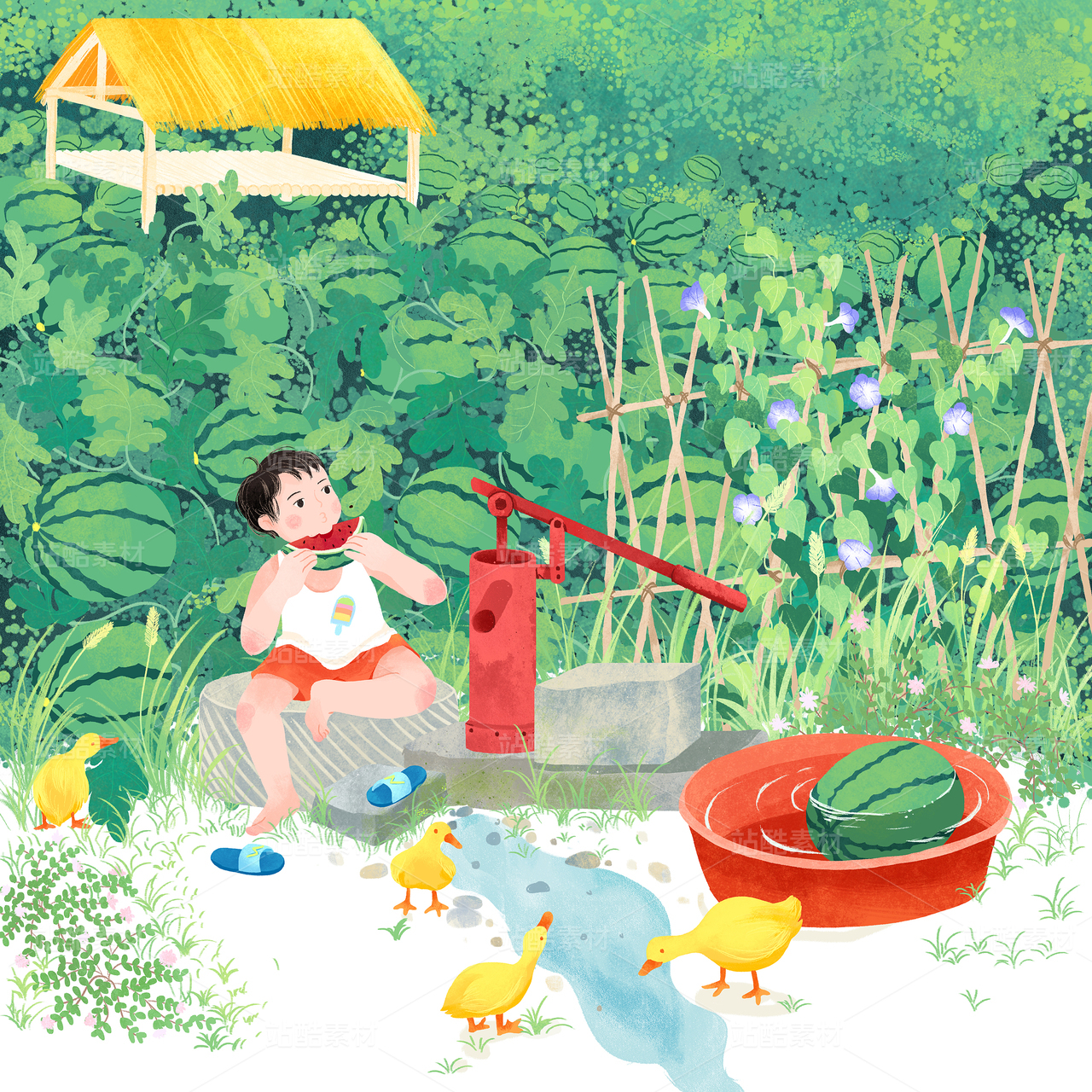 六月夏至吃西瓜水井鴨子男孩童趣節(jié)氣插畫