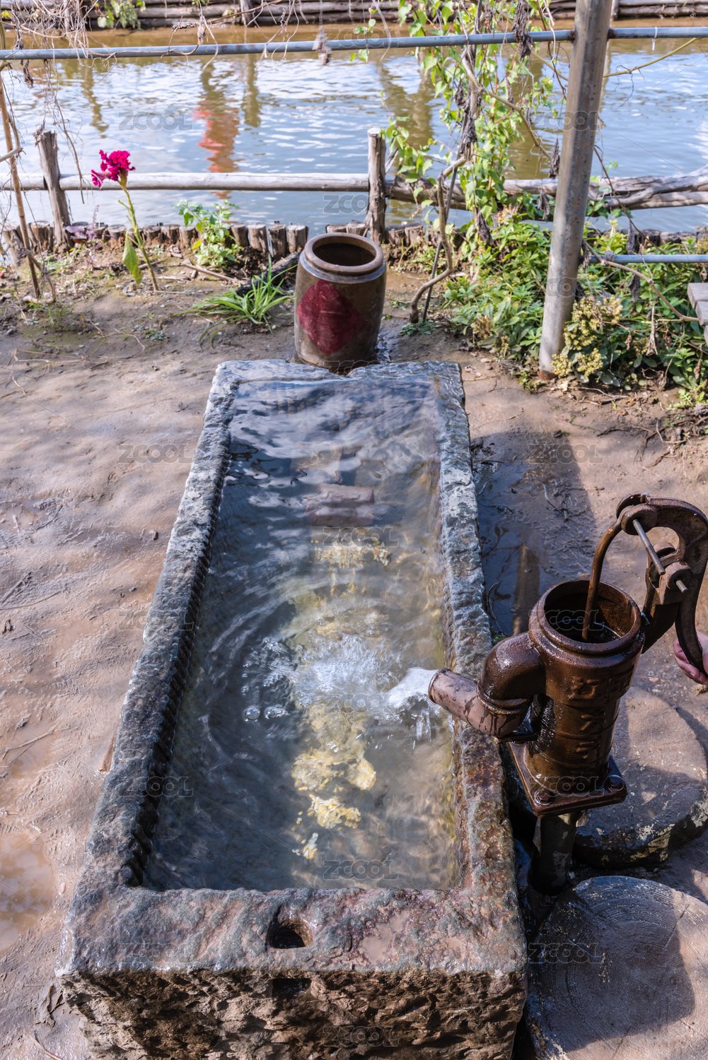 鄉(xiāng)村傳統(tǒng)石砌水井與木制吊桶
