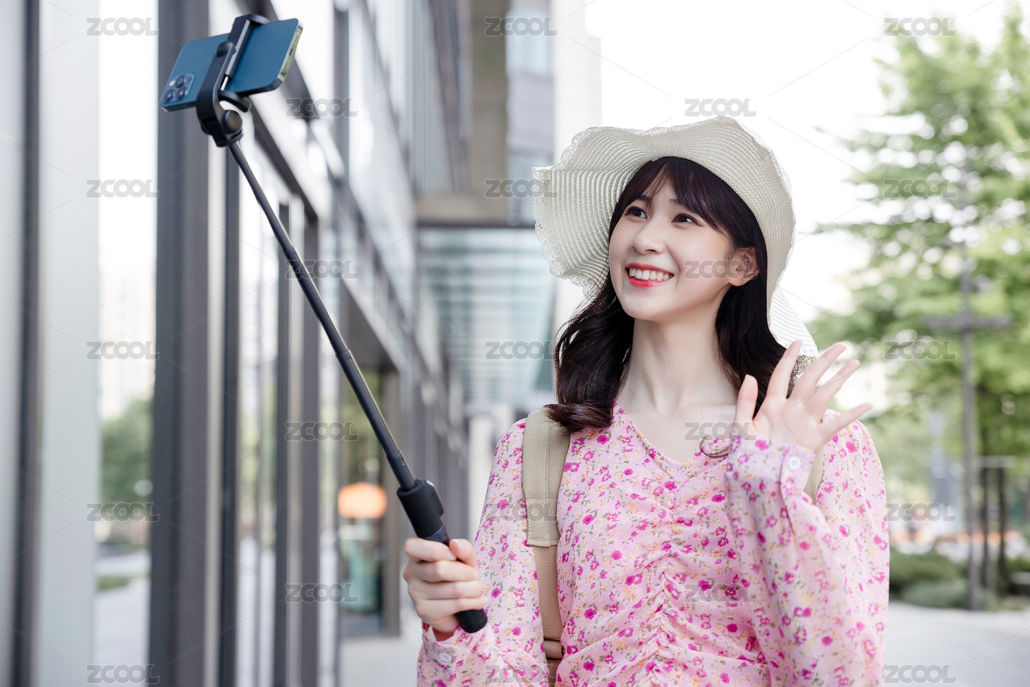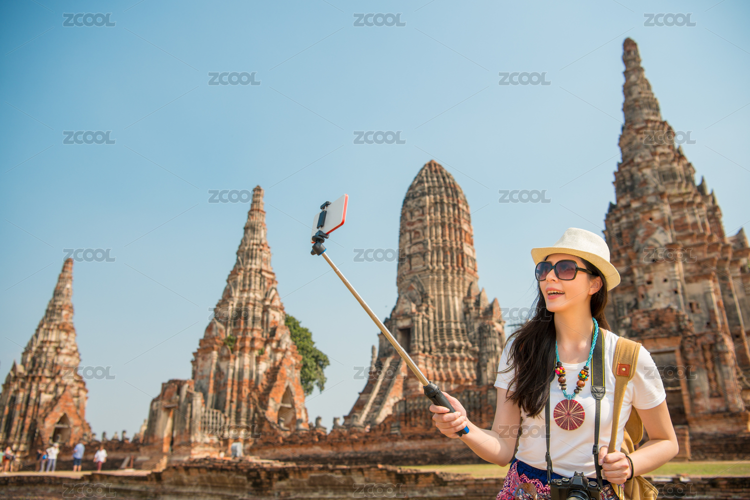 泰國大城府旅游正與自拍桿和智能手機享受視圖在柴瓦塔那蘭寺舍利塔旅游在亞洲的暑假圖片照片。