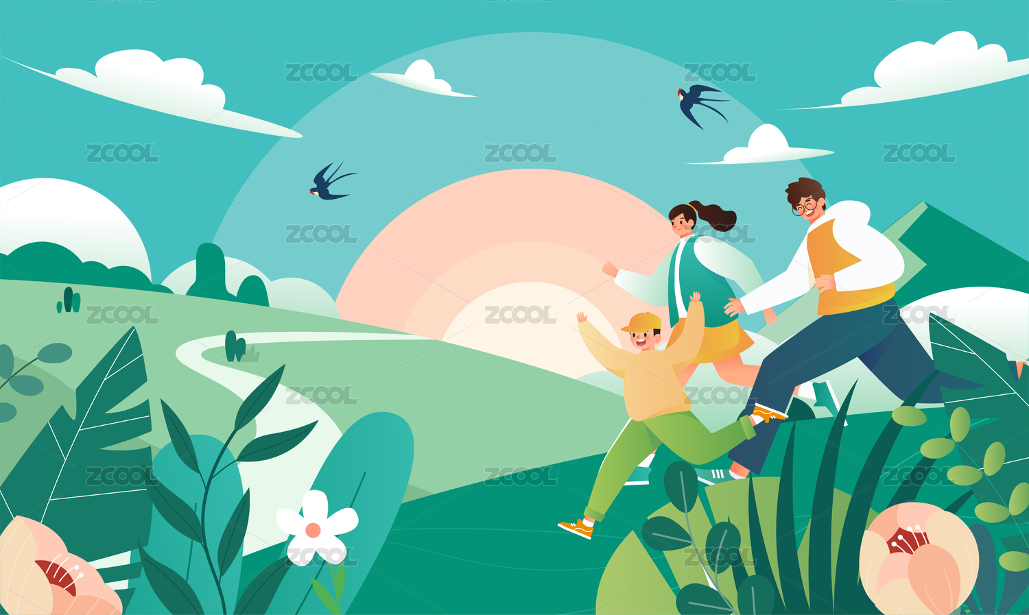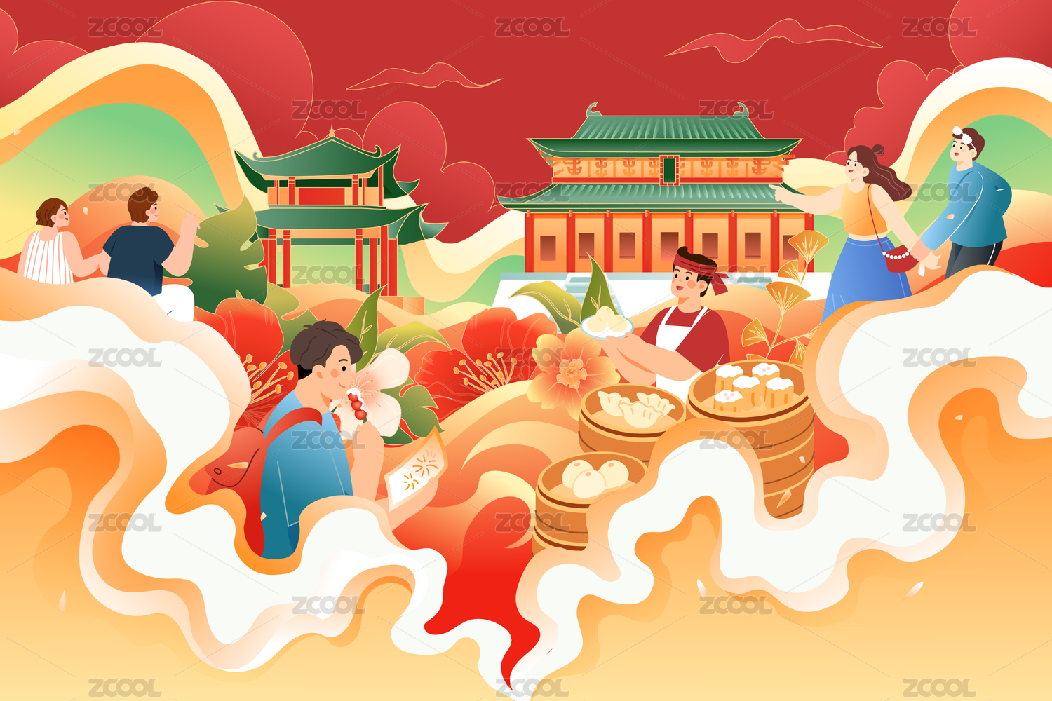 國慶節(jié)一家人出門景點旅游地標建筑國潮插畫