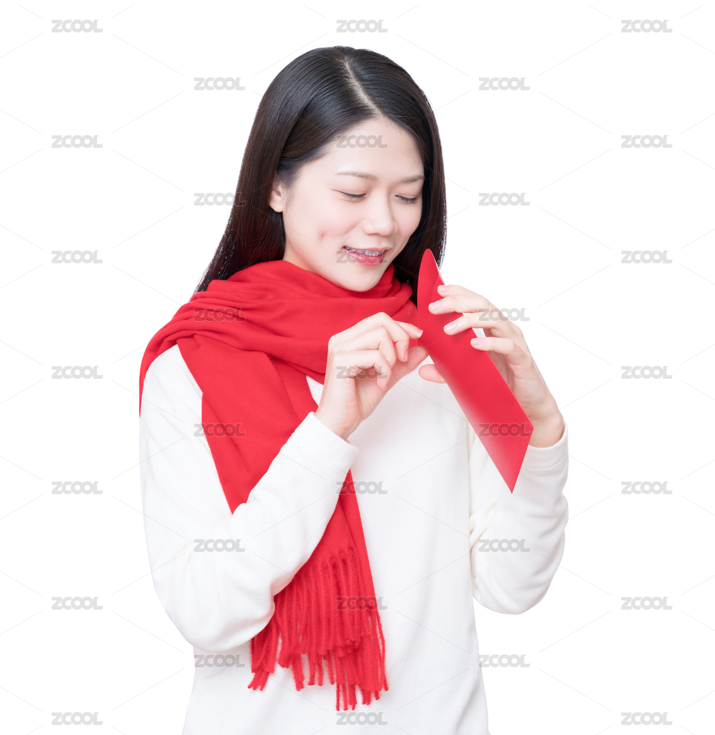 黑色長發(fā)的亞洲人看著打開的紅包,很開心的笑