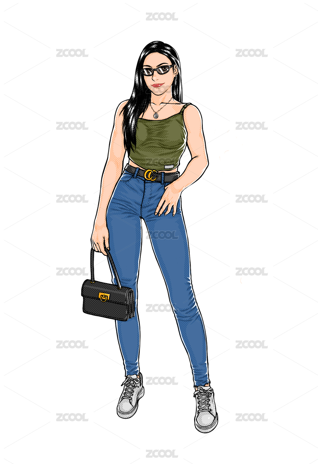 穿綠色吊帶藍(lán)色牛仔褲的黑色長發(fā)戴眼鏡女人